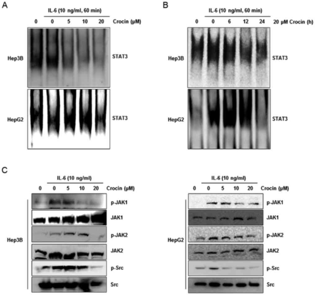 In the present study, we revealed that crocin suppressed the activation of the STAT3 pathway in IL-6-stimulated hepatocellular carcinoma cells. Crocin suppressed the activation of non-receptor protein tyrosine kinases (JAK1, JAK2 and Src) and upregulated SH2-containing tyrosine phosphatase (SHP-1). Crocin also downregulated STAT3-regulated gene products and promoted apoptotic progression in liver cancer cells.