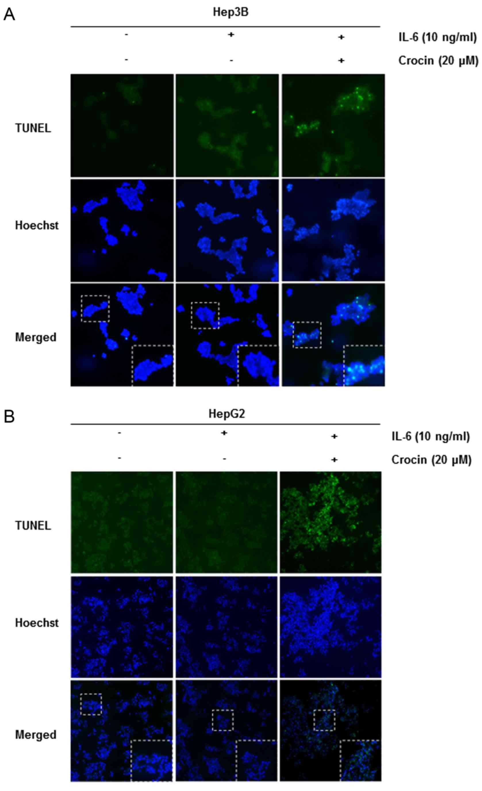 We also investigated whether suppression of STAT3 activation by crocin led to apoptosis. Cells were treated with 20 µM of crocin for different time-points and then examined for activation of caspases by western blotting using specific antibodies. We observed cleavage of caspase-9, caspase-3 and PARP at 20 µM of crocin for 24 h (Fig. 5B). Finally, we also determined that cells exposed to crocin were TUNEL-positive, further corroborating with evidence the initiation of apoptosis in these cells. These results clearly revealed that crocin induced caspase-dependent apoptosis in IL-6-stimulated Hep3B (Fig. 6A) and HepG2 (Fig. 6B).