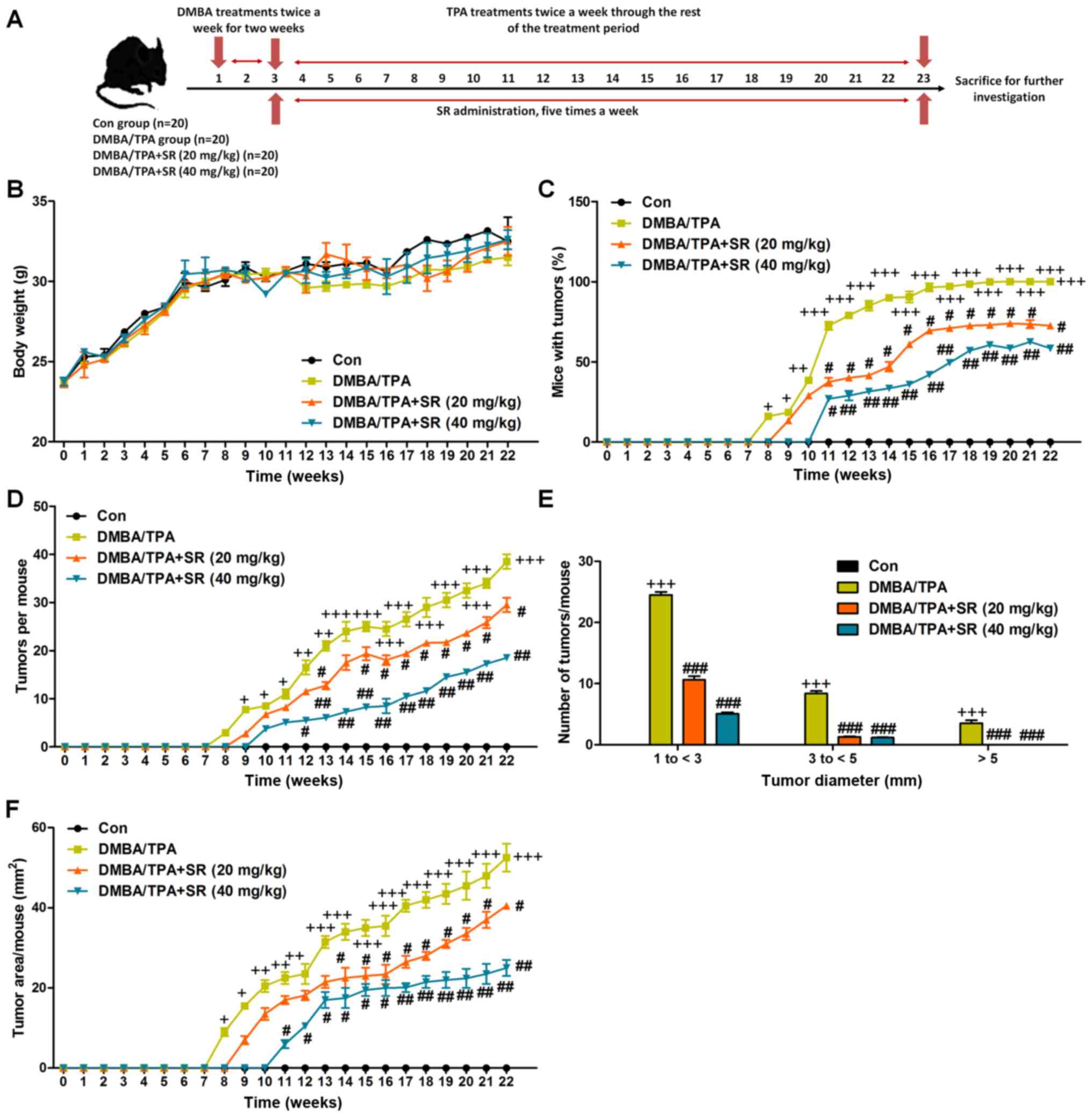 ICR mice were randomly divided into four groups, 20 animals per group. The experimental design of the in vivo study is exhibited in Fig. 1A. All mice were shaved ahead of our study. In brief, the groups receiving DMBA/TPA, and DMBA/TPA+SR were first administered 60 µg DMBA dissolved in 0.2 ml to the naked backs. DMBA was administered to mice for two weeks, from week 1 to week 3. The first two weeks after skin tumor initiation with DMBA, animals in the DMBA/TPA and DMBA/TPA+SR groups were further exposed to 4 µg TPA twice a week for a total of 20 weeks ranging from week 3 to week 23. In addition, the mice treated with SR (20 and 40 mg/kg) were topically treated 30 min before each DMBA/TPA treatment five times a week until the sacrifice of the animals at week 22 (32–35). DMBA and TPA were purchased from Sigma-Aldrich (St. Louis, MO, USA). SR (>98% purity, molecular formula: C14H20O7, CAS 10338-51-9) was purchased from Shanghai Ronghe Medicine Science and Technology Development Co, Ltd. (Shanghai, China). Sizes of the skin tumors >1 mm in diameter were measured every week using calipers. The dorsal skin of mice derived from different experiments was excised. After the fat was removed from the dorsal skin on ice, the skin tissue samples were placed in liquid nitrogen immediately for further research. The eye blood was collected for pro-inflammatory cytokine determination.