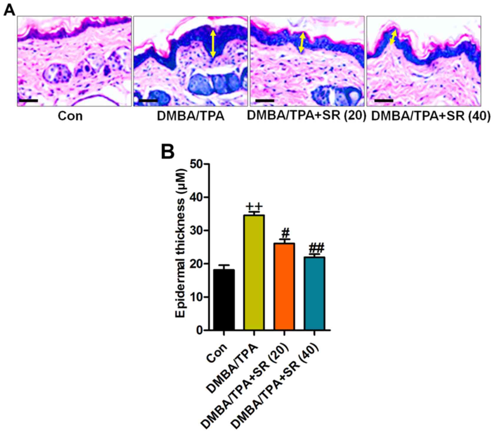 In order to explore the chemopreventive effect of SR, DMBA-initiated and TPA-promoted mouse skin carcinogenesis in mice was first established in vivo. Fisrt, the body weight of mice was measured, and no significant difference was observed among the different groups, although reduced body weight was exerted in the DMBA/TPA-treated group (Fig. 1B). Compared to the Con group, DMBA/TPA-induced mice showed a significantly high incidence of papillomas, which was reduced by SR (Fig. 1C). In addition, DMBA/TPA exposure triggered a higher multiplicity of skin papilloma formation that was suppressed in the mice treated with SR, exhibiting a reduced number of tumors per mouse (Fig. 1D). Furthermore, the suppressive effect of SR on tumorigenesis was supported by the papilloma size distribution (Fig. 1E). Consistently, tumor area was increased by DMBA/TPA exposure, which was reduced after SR administration with an increase in time (Fig. 1F). Consistently, the tumor area was elevated by DMBA/TPA treatment, which was reduced after SR administration with the increase of time (Fig. 1F). In addition, the histological analysis further revealed that SR markedly ameliorated the increase in epidermal thickness (hyperplasia) in mice with DMBA/TPA induction (Fig. 2). In conclusion, the animal study above strongly indicated that SR efficiently prevented skin carcinogenesis induced by DMBA/TPA and TPA in mice.