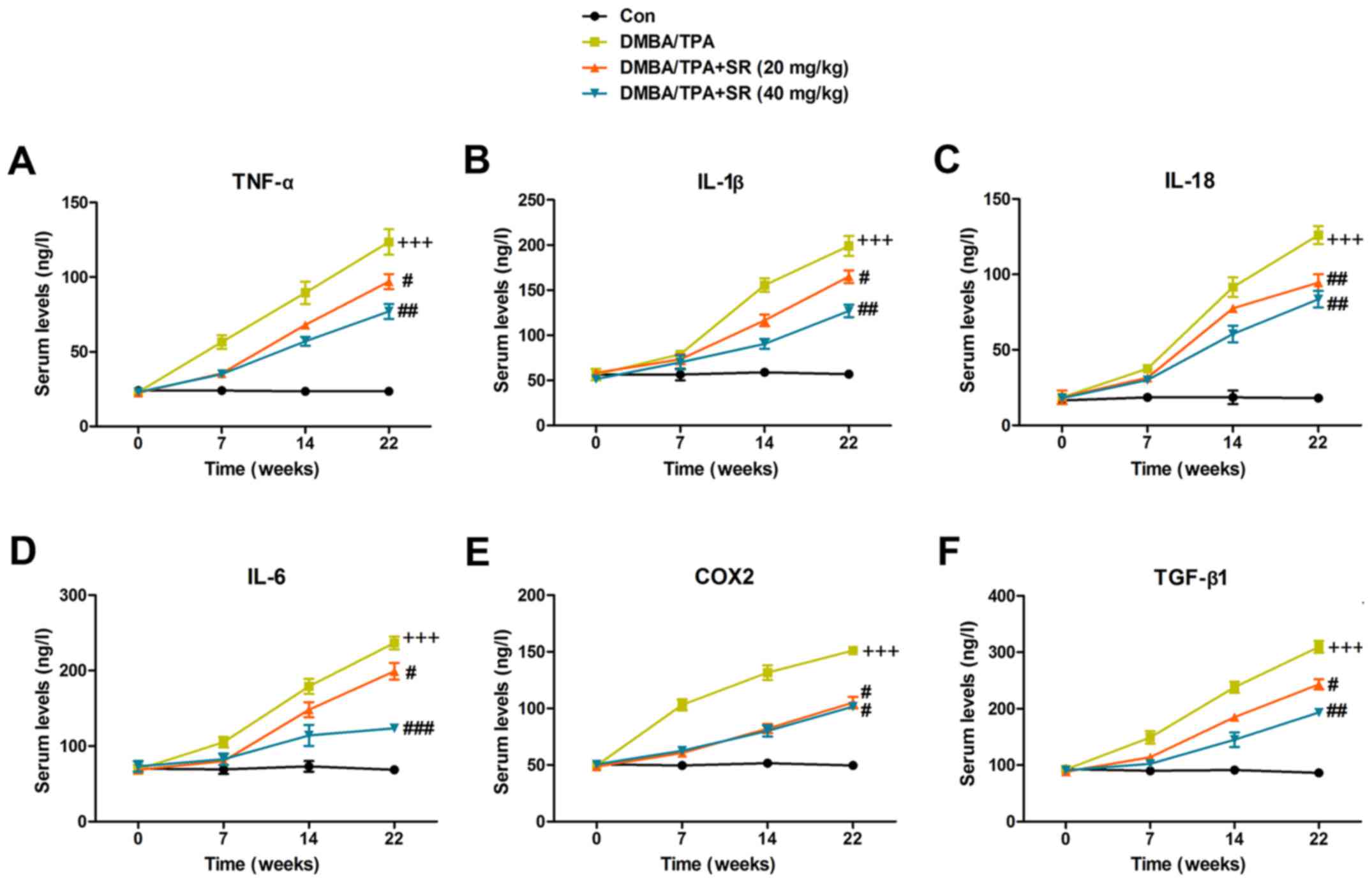 Pro-inflammatory cytokines were also determined to assess the role of SR in DMBA/TPA-induced mice with skin cancer. As shown in Fig. 3A, serum TNF-α was higher in the DMBA/TPA-treated mice, which was enhanced with increasing time. SR also significantly suppressed TNF-α expression. Next, cytokines IL-1β (Fig. 3B), IL-18 (Fig. 3C), IL-6 (Fig. 3D), COX2 (Fig. 3E) and TGF-β1 (Fig. 3F) were all observed to have elevated expression in the DMBA/TPA-treated mice, which were suppressed by SR during the treatment procedure. Taken together, the findings above indicated that SR has a potential role in blocking the secretion of pro-inflammatory cytokines.