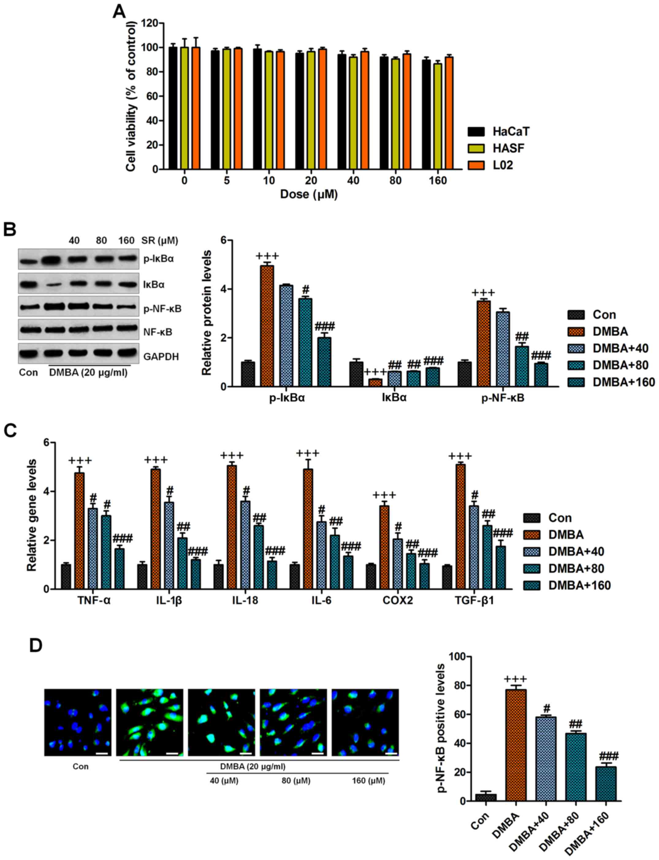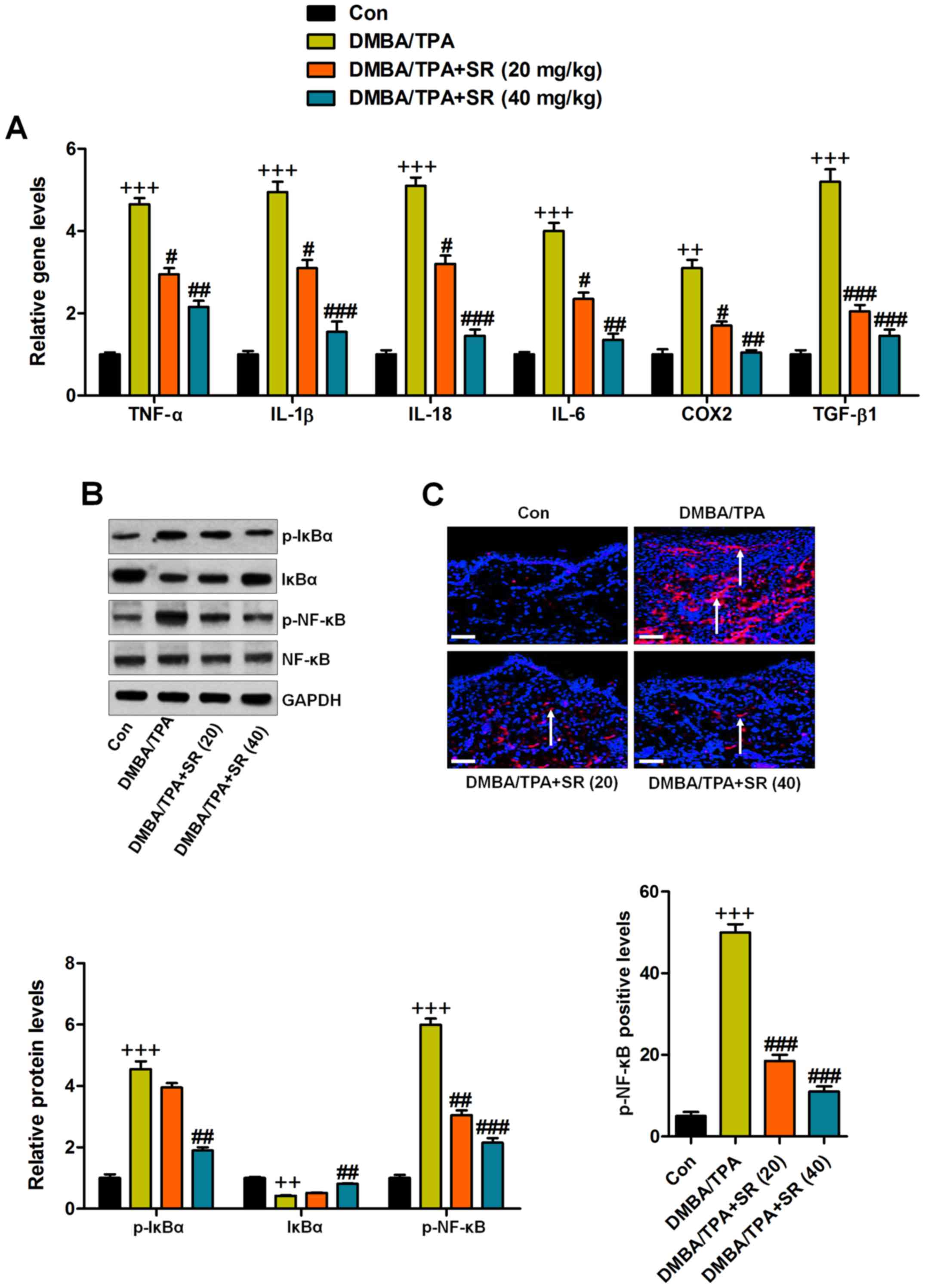 Next, we attempted to ascertain whether the NF-κB signaling pathway is also involved in SR-ameliorated skin cancer induced by DMBA/TPA. As shown in Fig. 4A, RT-qPCR analysis further indicated that pro-inflammatory cytokines, including TNF-α, IL-1β, IL-18, IL-6, and COX2, as well as anti-inflammatory factor TGF-β1, were increased in the tissue samples of DMBA/TPA-induced mice, which were all reduced by SR administration in a dose-dependent manner. The IκB/NF-κB signaling pathway was also explored. The data indicated that IκBα phosphorylation was upregulated in the DMBA/TPA-treated mice, while IκBα was downregulated. Phosphorylated NF-κB levels were also elevated due to DMBA/TPA induction in mice (Fig. 4B). Of note, SR exerted an inhibitory effect on IκBα and NF-κB phosphorylation, indicating its anti-inflammatory property. Furthermore, the immunofluorescence analysis revealed that enhanced NF-κB phosphorylated levels by DMBA/TPA were reduced after SR administration (Fig. 4C). Together, the results above demonstrated that SR inhibited skin carcinogenesis by impeding inflammation, linked to the suppression of the IκBα/NF-κB signaling pathway.