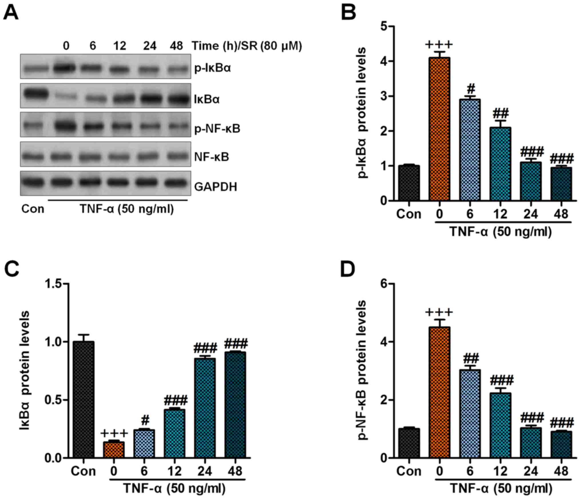 As it was described above, we found that inflammation blockage by SR might be a possible molecular mechanism by which to prevent skin carcinogenesis progression in DMBA/TPA-induced mice in vivo. In order to further confirm our findings above, the in vitro study was conducted. First MTT assays were used to calculate the safety of SR to normal cells. The results indicated that compared to the group in the absence of any treatment, no significant difference was observed among the various groups of treated cells as indicated (Fig. 5A). Thus, we supposed that SR might be safe for application with little cytotoxicity to normal cells. Normal human epidermal keratinocytes, HaCaT, were treated with 20 µg/ml DMBA for 48 h in the absence or presence of SR at 40, 80 and 160 µM. As shown in Fig. 5B, we found that cells exposed to DMBA displayed accelerated IκBα phosphorylation and reduced IκBα expression, which were reversed by SR administration. NF-κB was also activated by DMBA exposure. Significantly, SR treatment dose-dependently reduced NF-κB activity in the cells. RT-qPCR analysis indicated that SR suppressed high levels of pro-inflammatory cytokines, including TNF-α, IL-1β, IL-18, IL-6, and COX2, and TGF-β1 was also found to be reduced, indicating the attenuated inflammatory response, which were in line with the in vivo results (Fig. 5C). Moreover, the immunofluorescence assays also showed that SR reduced NF-κB phosphorylation caused by DMBA in normal human epidermal keratinocytes (Fig. 5D). Next, to further illustrate the role of SR in suppressing inflammation, the cells were pre-treated with SR (80 µM) for different times, ranging from 0 to 48 h. Then, they were exposed to 50 ng/ml TNF-α for another 1 h to induce inflammation. The western blot analysis indicated that IκBα and NF-κB were activated, which were markedly reduced by SR administration in a time-dependent manner (Fig. 6A, B and D). Oppositely, the downregulated level of IκBα due to TNF-α exposure was reversed by SR treatment (Fig. 6A and C). In conclusion, the data above indicate that SR, indeed, suppressed the inflammatory response in DMBA-treated cells or skin tissue samples, exhibiting its preventive effects on skin carcinogenesis.
