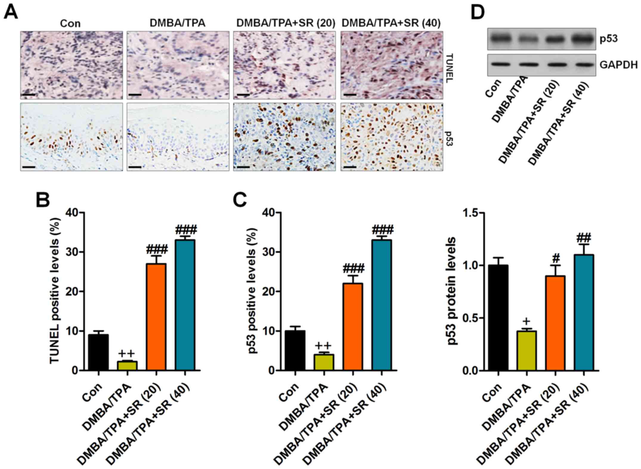 Immunohistochemical analysis indicated that in the skin tissue samples of the DMBA/TPA-induced mice reduced TUNEL levels were noted when compared to the control group, revealing that the apoptotic response might be disrupted following DMBA/TPA treatment. In contrast, SR treatment significantly enhanced the percentage of TUNEL-positive cells, suggesting cell death during skin carcinogenesis (Fig. 7A and B). p53, an essential tumor suppressor, was found to be downregulated by DMBA/TPA, and in agreement with TUNEL alterations, SR administration reversed the p53 reduction (Fig. 7A and C). Additionally, western blot analysis illustrated that DMBA/TPA reduced p53 expression, while SR augmented p53 protein expression levels (Fig. 7D). In summary, the data above indicated that apoptosis might be involved in SR-regulated skin carcinogenesis caused by DMBA/TPA.