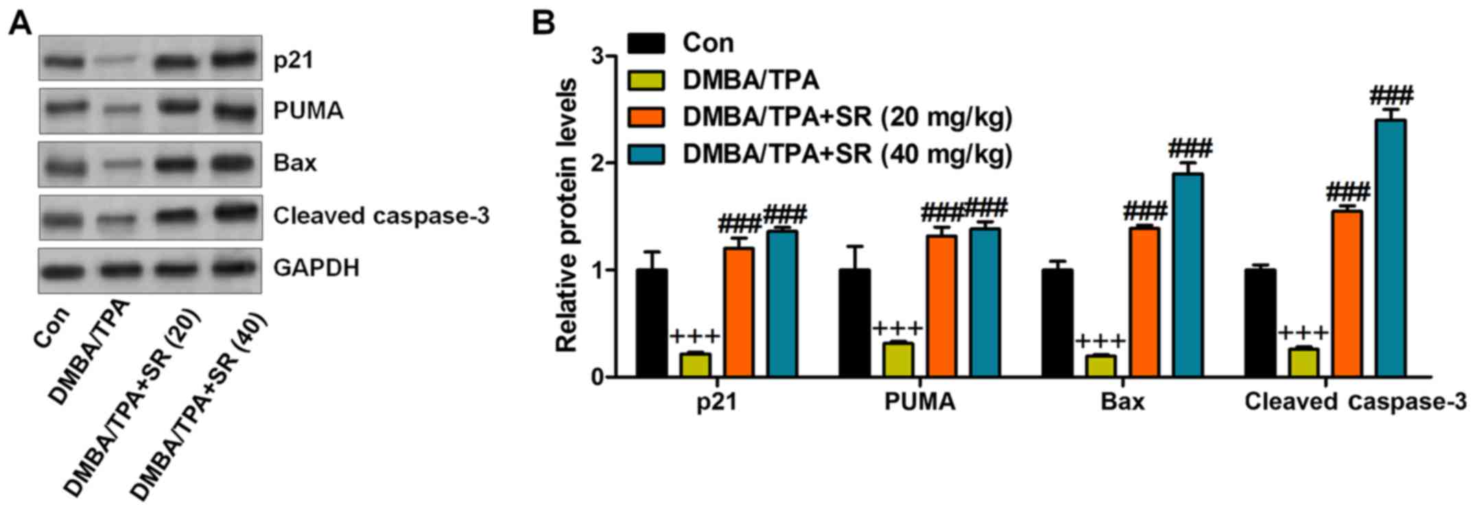 Apoptosis is considered as a key molecular mechanism by which various cancer cells are induced to death (27,40,41,56). Apoptosis is tightly controlled by the balance between pro- and anti-apoptotic members of the Bcl-2 protein family. Changes in the relative expression levels of such molecules will ultimately decide the cell fate (57). Additionally, cysteinyl aspartate specific proteinases (caspases) play important roles during apoptosis (58). Increase in pro-apoptotic molecules, including Bax, helps to induce apoptosis by enhancing caspase-3 cleavage, which has been well known to play an important role in inducing apoptosis (59). Therefore, we subsequently evaluated the protein levels of pro-apoptotic Bax and caspase-3 molecules which define the cell propensity to apoptosis (60). p53, an important tumor suppressor, provides powerful intrinsic defense against various cancers through its diverse function as a major modulator of apoptosis, the cell cycle and senescence (61,62). Abnormalities of p53 have been observed in patients suffering from different cancers (63). Furthermore, p53 shows transcriptional activities to regulate the expression of pro-apoptotic gene: PUMA (64). PUMA is known as the activator for Bax, and is involved in mitochondrial-mediated apoptosis (65,66). p21 is a downstream signal of p53, which participates in apoptosis induction (67). SR has been confirmed to modulate apoptosis in numerous types of injuries, including brain, vascular disease and colon cancer (68–70). SR was observed to promote an apoptotic response to induce cell death, contributing to colon cancer and leukemia prevention. In the present study, western blot analysis indicated that SR upregulated p53, p21, PUMA, Bax and caspase-3 cleavage, contributing to apoptosis development both in in vivo and in vitro models induced by DMBA/TPA and DMBA, respectively. Furthermore, TUNEL assay of tissue samples and flow cytometry analysis of cells also confirmed the role of SR in apoptosis induction during skin carcinogenesis. Together, our study revealed that triggering apoptosis might be a possible molecular mechanism by which SR showed preventive effects against skin cancer.
