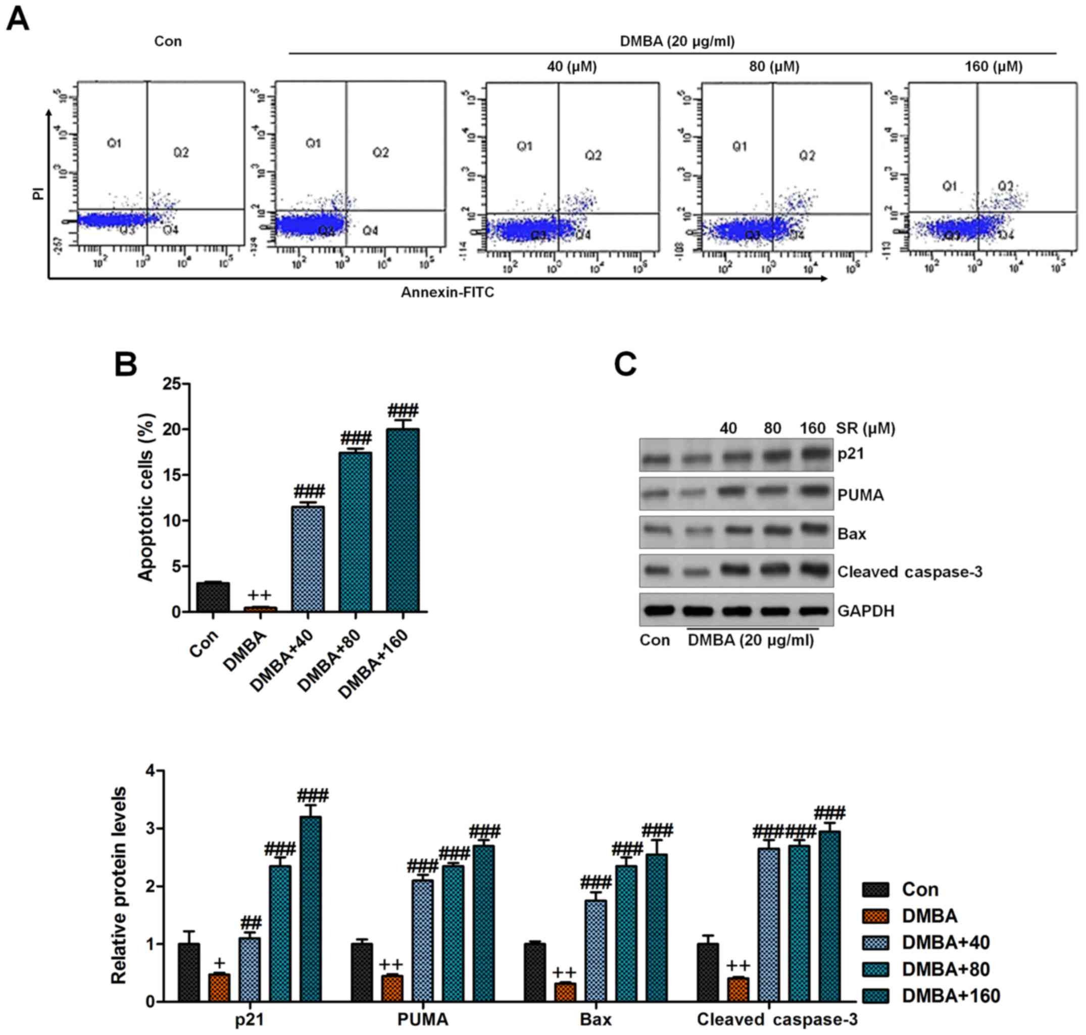 p53 can induce apoptosis, which is linked to Bax or other pro-apoptotic molecules (37). Therefore, we analyzed the expression of these proteins in the skin tissues of mice after various treatments. The immunoblot analysis showed a decrease in p21, PUMA, Bax, and cleaved caspase-3 in the DMBA/TPA-treated mice, which were significantly reversed by SR (Fig. 8). Next, the in vitro study was conducted to further confirm our data above. Human normal epidermal keratinocytes, HaCaT, exposed to DMBA were treated with or without SR at the indicated concentrations. Then, flow cytometric analysis indicated that DMBA caused reduced percentages of apoptotic cells, which was in line with the TUNEL assays in vivo. Notably, SR treatment enhanced apoptosis in the DMBA-treated cells (Fig. 9A and B). Finally, pro-apoptotic signals of p21, PUMA, Bax and cleaved caspase-3 protein levels were also reduced by DMBA in vitro, which were elevated after SR administration, indicating the role of SR in inducing apoptosis to avoid skin carcinogenesis in vitro (Fig. 9C).