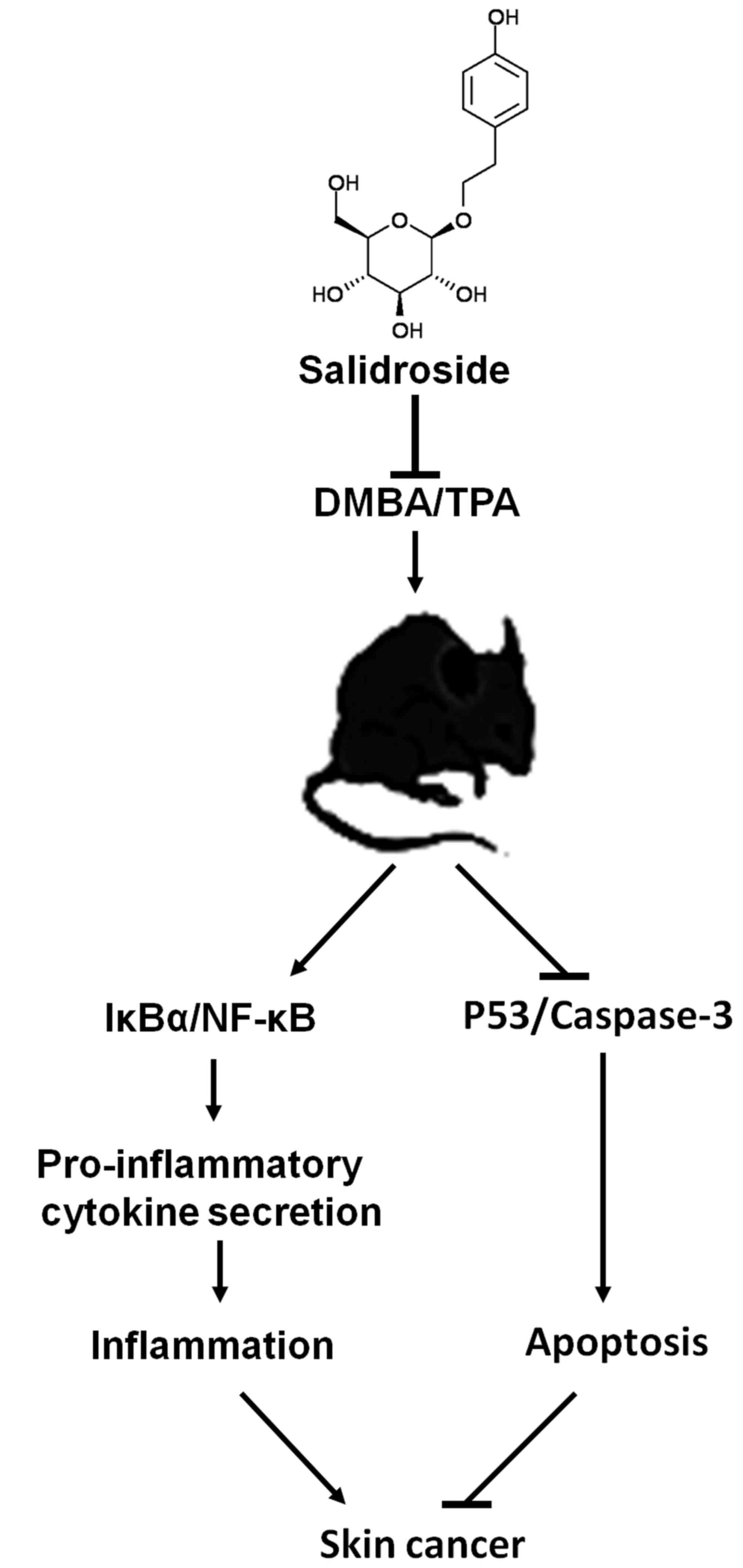 In conclusion, we found that SR prevents the carcinogenesis of mouse skin tissue initiated by DMBA/TPA. SR acts as a drug to suppress skin tumors in mice by inactivating the IκBα/NF-κB pathway, thus reducing the secretion of pro-inflammatory cytokines. In addition, p53 and caspase-3 signaling pathways were enhanced by SR, resulting in apoptosis to prevent skin carcinogenesis (Fig. 10). The finding supports the proposal that SR has skin tumor-suppressive activity, which may be a therapeutic strategy for human skin cancer treatment. However, further study is required to confirm its function in patients with skin tumors.