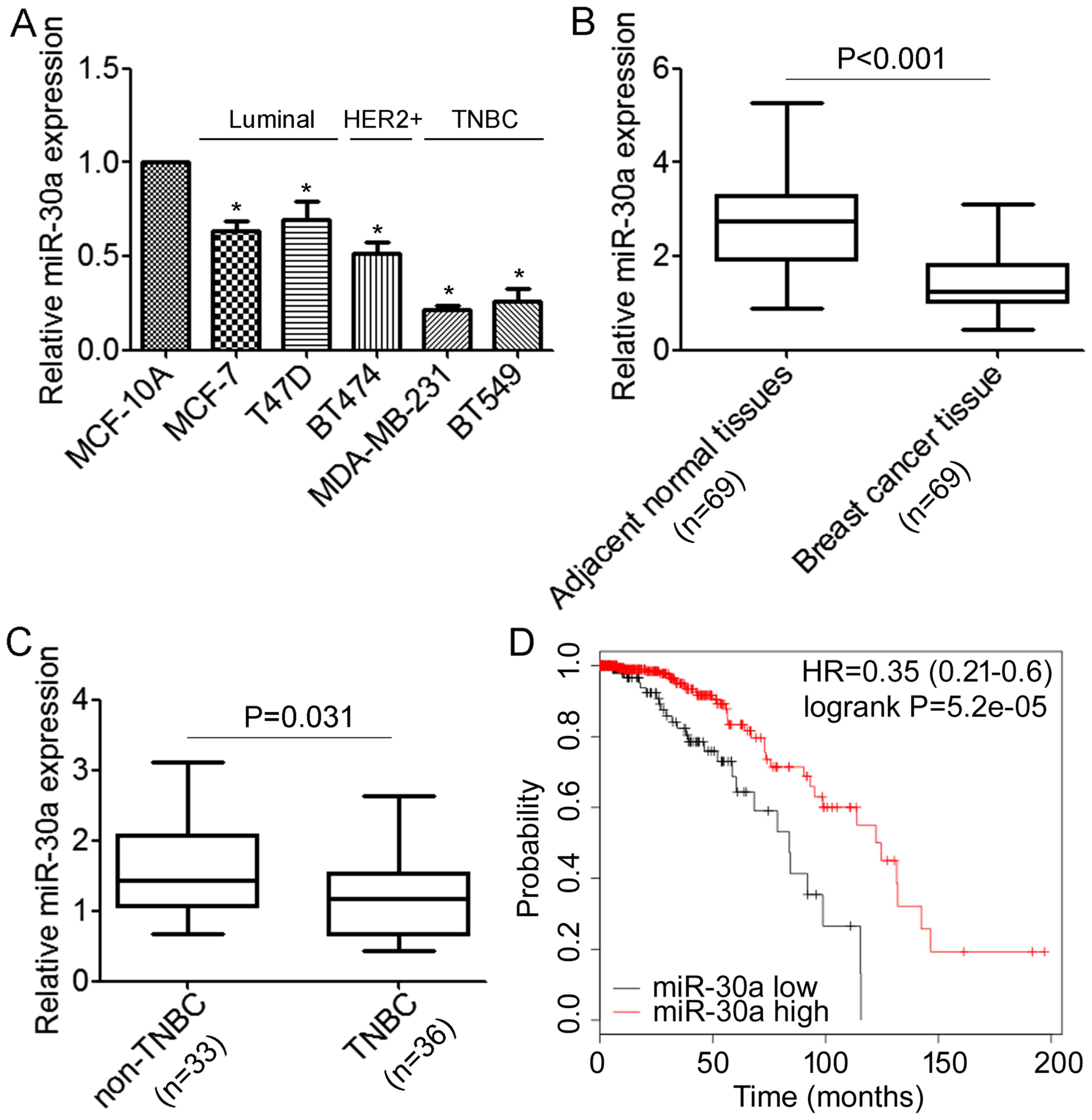 The prognostic value of miR-30a was analyzed by a Web-based Kaplan-Meier plotter (http://www.kmplot.com/), which is a meta-analysis tool of gene expression and survival data of 5,143 breast cancer patients (2015 version) using multiple microarray data.