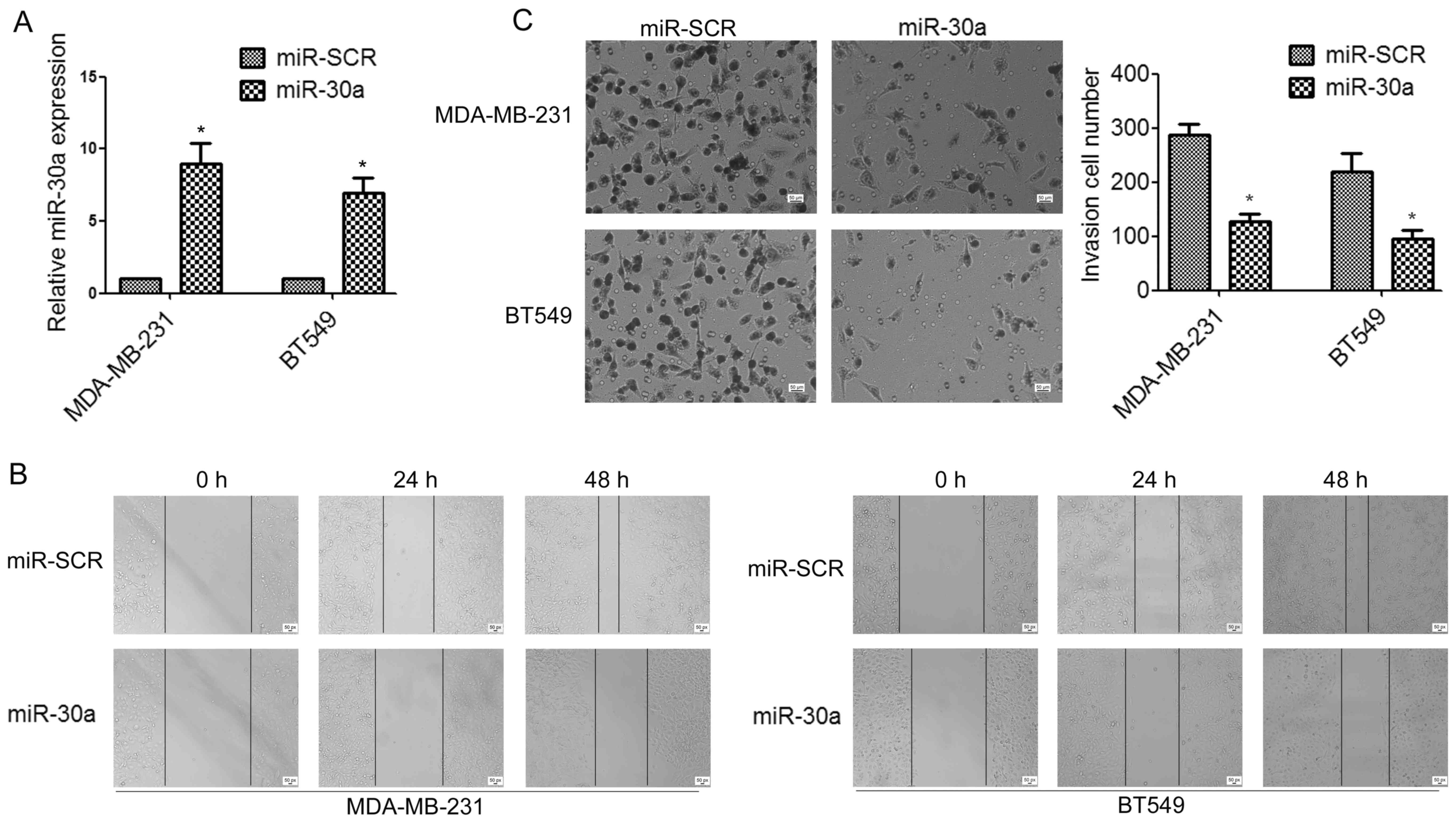 To determine whether miR-30a can affect TNBC cell migration and invasion, we established stable miR-30a-precursor expressing and negative control (miR-SCR) cell lines by lentiviral transfections (Fig. 2A). Wound healing assay indicated that the overexpression of miR-30a in MDA-MB-231 and BT549 cells significantly suppressed cell migration, compared to the control group (Fig. 2B). Moreover, Transwell assays demonstrated that ectopic expression of miR-30a significantly impaired invasion of TNBC cells (Fig. 2C).