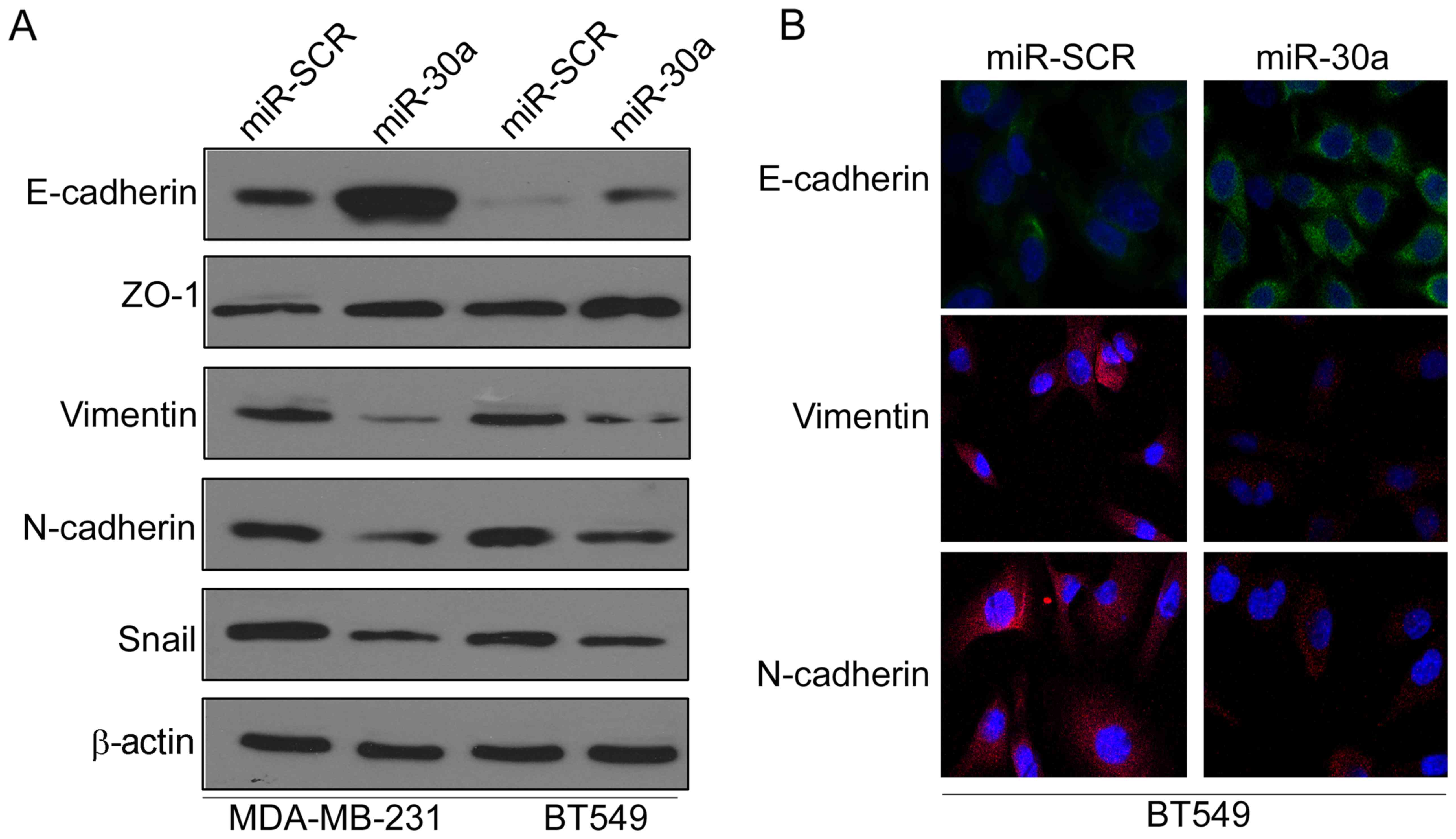 Epithelial-mesenchymal transition (EMT) has been revealed to be crucial in promoting cancer progression and metastasis (13). Thus, we investigated whether miR-30a inhibited EMT of TNBC cells by investigating the expression levels of EMT-related markers. Western blot analysis indicated that ectopic expression of miR-30a significantly increased the expression of epithelial marker E-cadherin, but reduced the expression of mesenchymal markers vimentin and N-cadherin in MAD-MB-231 and BT549 cells (Fig. 3A). Moreover, immunofluorescence analysis further confirmed that the expression of E-cadherin was increased, whereas the expression of vimentin and N-cadherin was decreased in miR-30a-expressing BT549 cells (Fig. 3B).