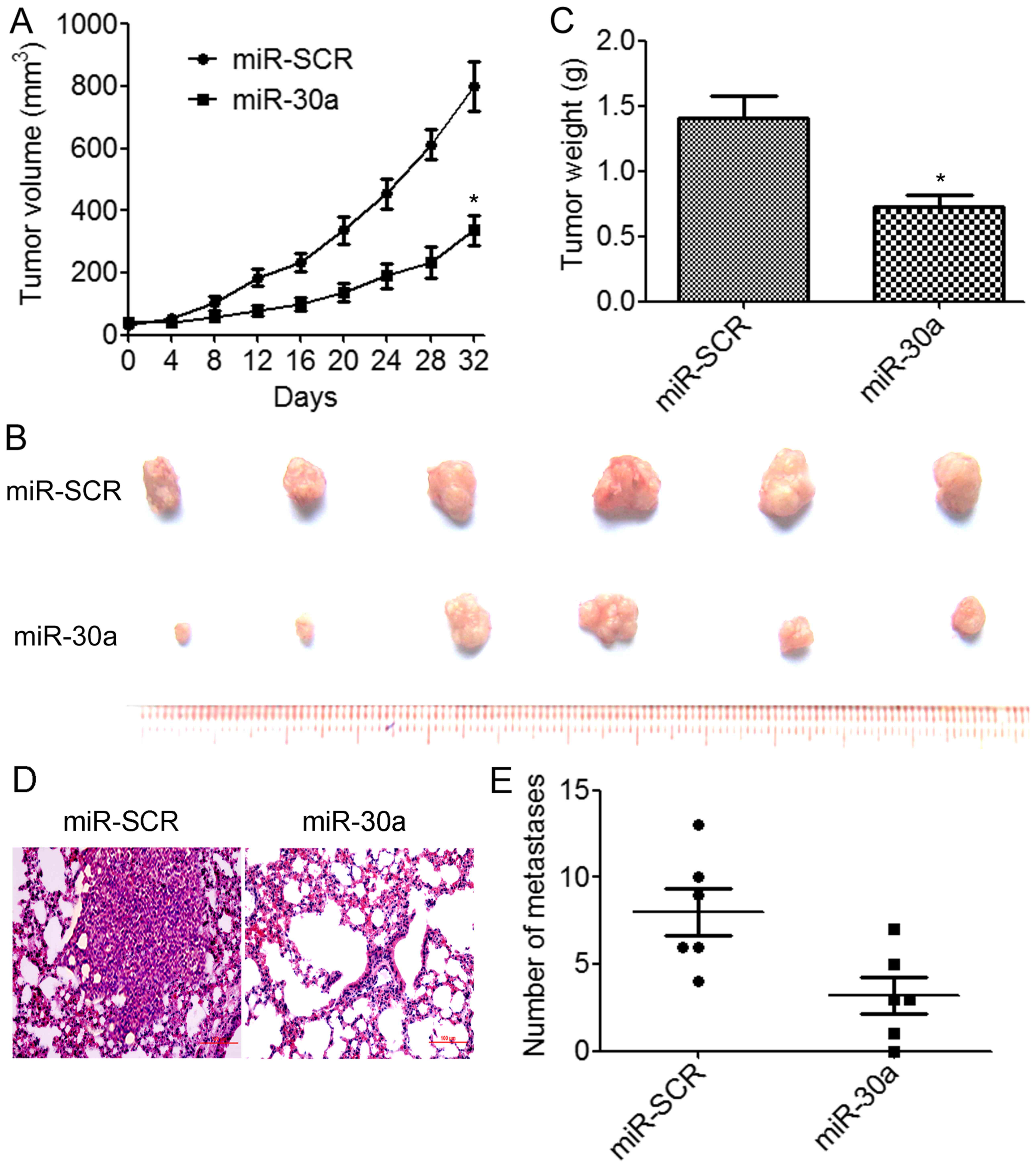 We further assessed the effects of miR-30a overexpression on tumor growth and metastasis in vivo. BT549/miR-30a cells that stably expressed miR-30a or BT549/miR-SCR control cells were implanted into the right flanks of nude mice by subcutaneous injections (N=6 animals/group). We determined that the overexpression of miR-30a resulted in a significant decrease in tumor volumes compared to the control group (Fig. 4A). The weights and size of excised tumors from the miR-30a-overexpressing group were significantly decreased than those from the control group (Fig. 4B and C). We further investigated whether miR-30a suppressed TNBC metastasis in vivo. BT549/miR-30a cells or BT549/miR-SCR cells were injected into the lateral tail vein of nude mice. The results indicated that lung tumor nodules were significantly reduced in the mice injected with the BT549/miR-30a cells compared to the BT549/miR-SCR cells (Fig. 4D and E). These results demonstrated that miR-30a suppressed TNBC growth and metastasis in vivo.