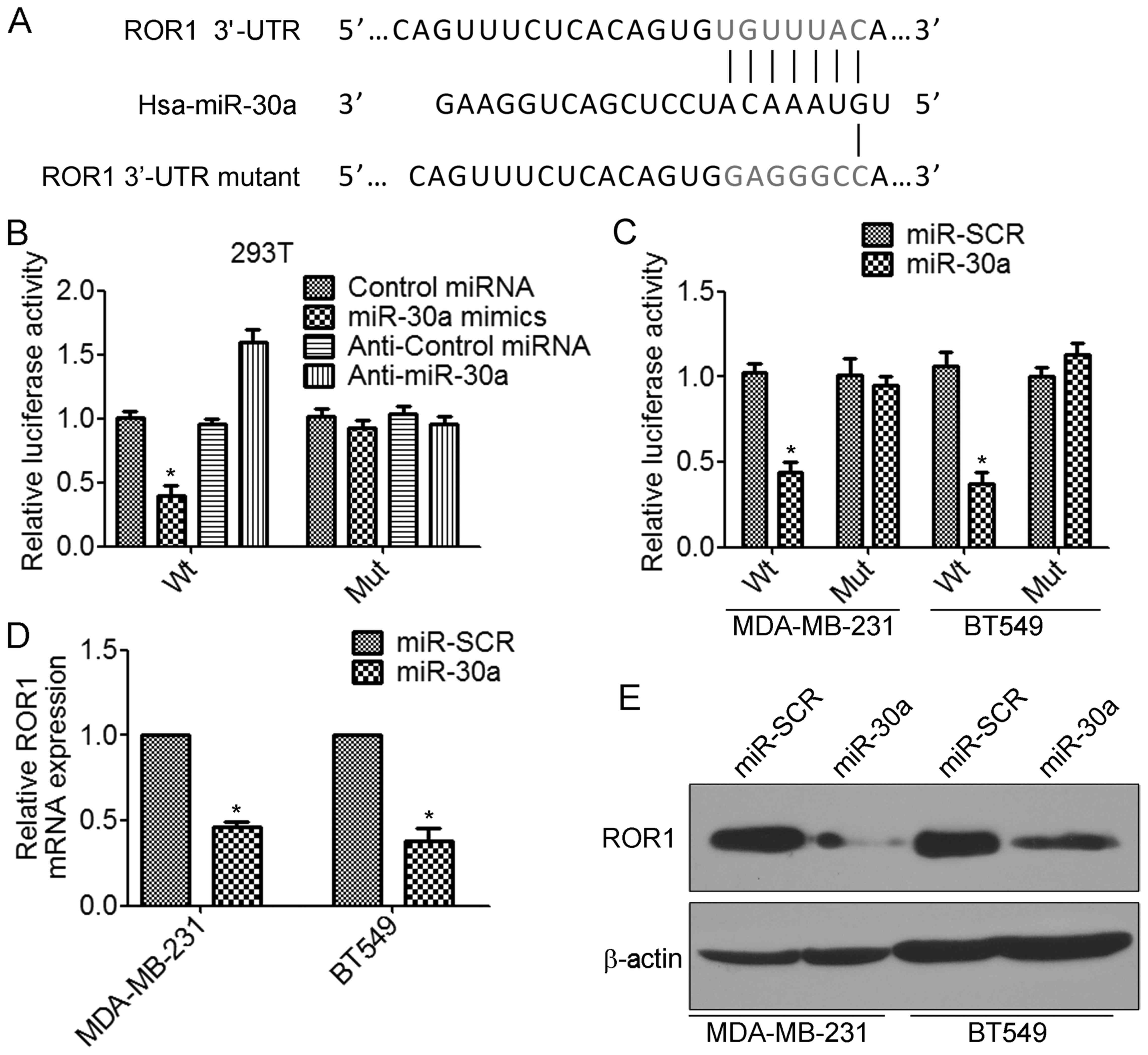 We further investigated the molecular mechanism by which miR-30a inhibits the invasion and metastasis of TNBC cells. According to the prediction by TargetScan database, the 3′-UTRs of receptor tyrosine kinase-like orphan receptor 1 (ROR1) mRNA contain putative miR-30a binding sites (Fig. 5A). To determine whether miR-30a regulates ROR1 by binding to the corresponding 3′-UTRs, we cloned the 3′-UTR from ROR1 into the pmirGLO luciferase reporter vector. We also generated the mutant ROR1-3′-UTR vector, in which the sequence for miR-30a binding on the 3′-UTR was mutated (Fig. 5A). The luciferase assay revealed that transfection of miR-30a mimics significantly decreased the ROR1-3′-UTR wild-type but not the ROR1-3′-UTR mutant luciferase levels in 293T cells (Fig. 5B). In contrast, transfection of anti-miR-30a increased the ROR1-3′-UTR wild-type luciferase activity (Fig. 5B). Similar results were found in TNBC cells. Overexpression of miR-30a significantly inhibited ROR1-3′-UTR wild-type luciferase activity (Fig. 5C). Furthermore, we found that overexpression of miR-30a significantly decreased the levels of ROR1 mRNA in MDA-MB-231 and BT549 cells (Fig. 5D). There results were confirmed by western blot analysis (Fig. 5E). Collectively, these results indicated that miR-30a inhibited the expression of ROR1 by directly targeting the 3′-UTR of ROR1.