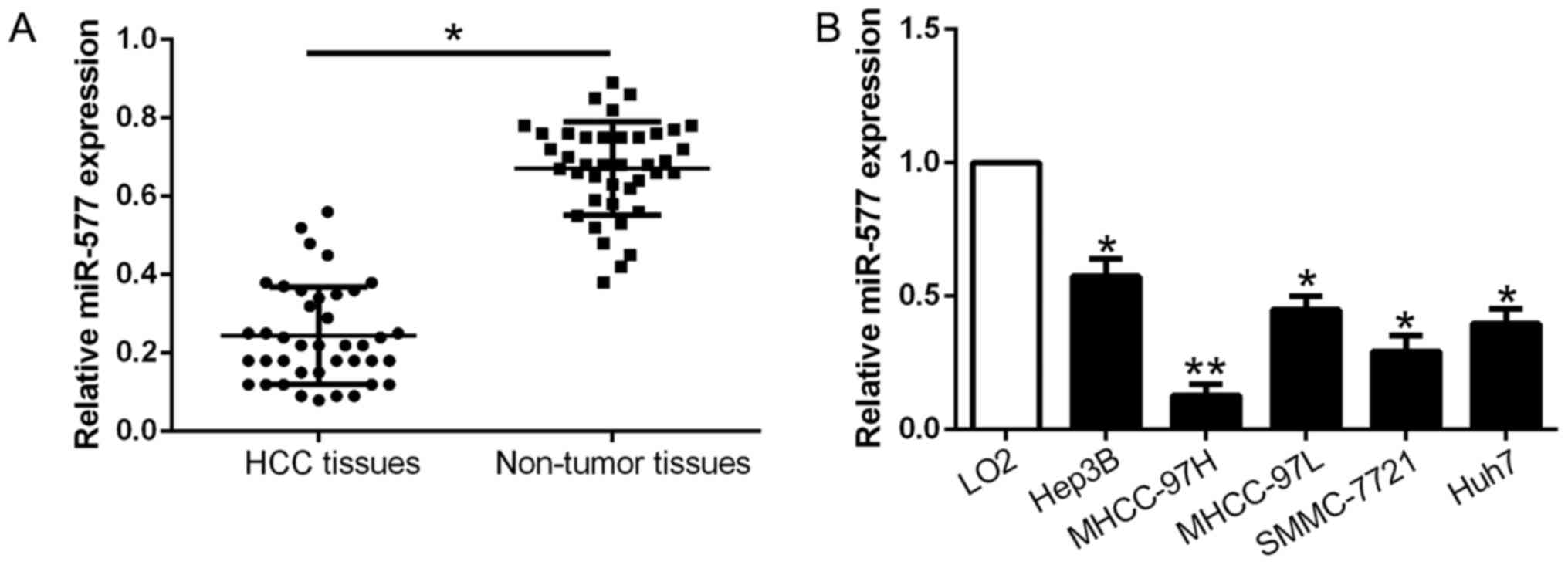 qPCR was conducted to explore miR-577 expression in 40 pairs of tumor tissues and corresponding adjacent non-tumor tissues. As exhibited in Fig. 1A, miR-577 was markedly downregulated in the HCC tissues when compared with that noted in the adjacent non-tumor tissues (P<0.05, Fig. 1A). Consistently, miR-577 expression was obviously lower in the HCC cell lines compared to the normal liver cell LO2 (P<0.05, Fig. 1B). The above results revealed that miR-577 expression was downregulated in HCC and may play a crucial role in HCC development.