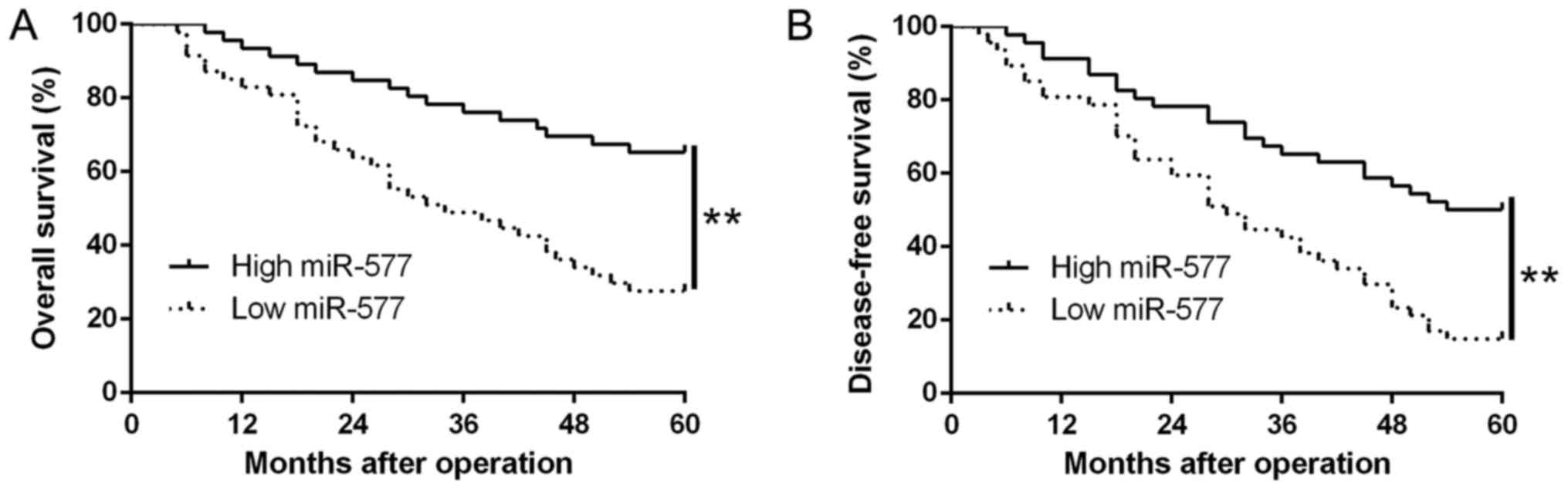 Ninety-three patients were assigned into two subgroups (high/low miR-577 group), based on the median value of miR-577 expression in HCC tissues. We found that low miR-577 expression was notably related to venous invasion (P=0.007, Table I) as well as advanced tumor-node-metastasis (TNM) stage (P=0.018, Table I). Moreover, results from the Kaplan-Meier analysis revealed that patients with low miR-577 expression possessed worse overall survival (OS) (P=0.0001, Fig. 2A) and disease-free survival (DFS) (P=0.0001, Fig. 2B). Thus, the above data suggest that miR-577 could be used to predict the outcome of HCC patients.
