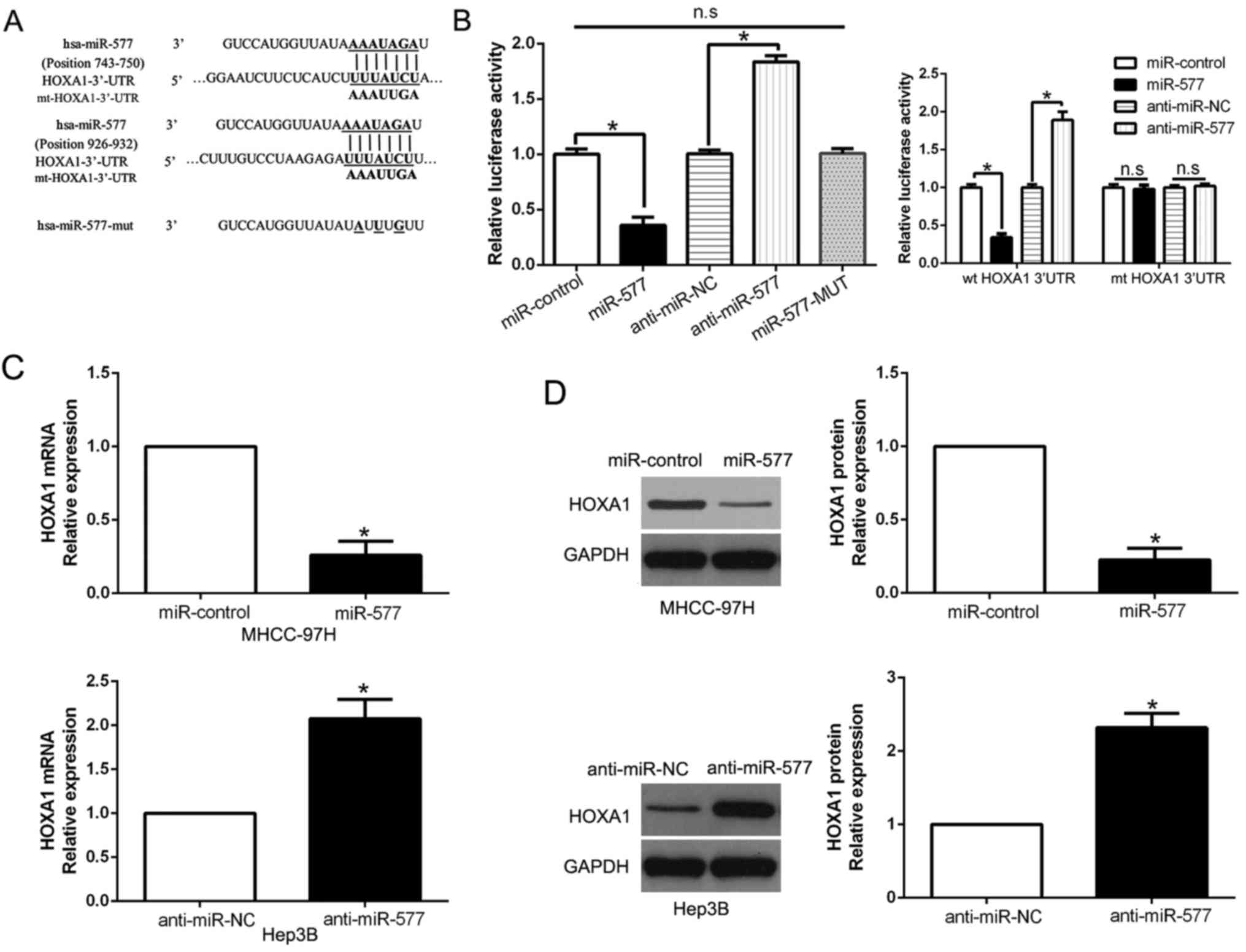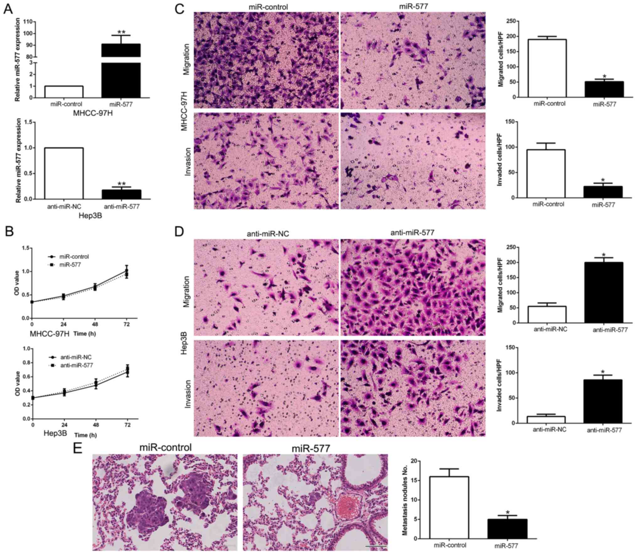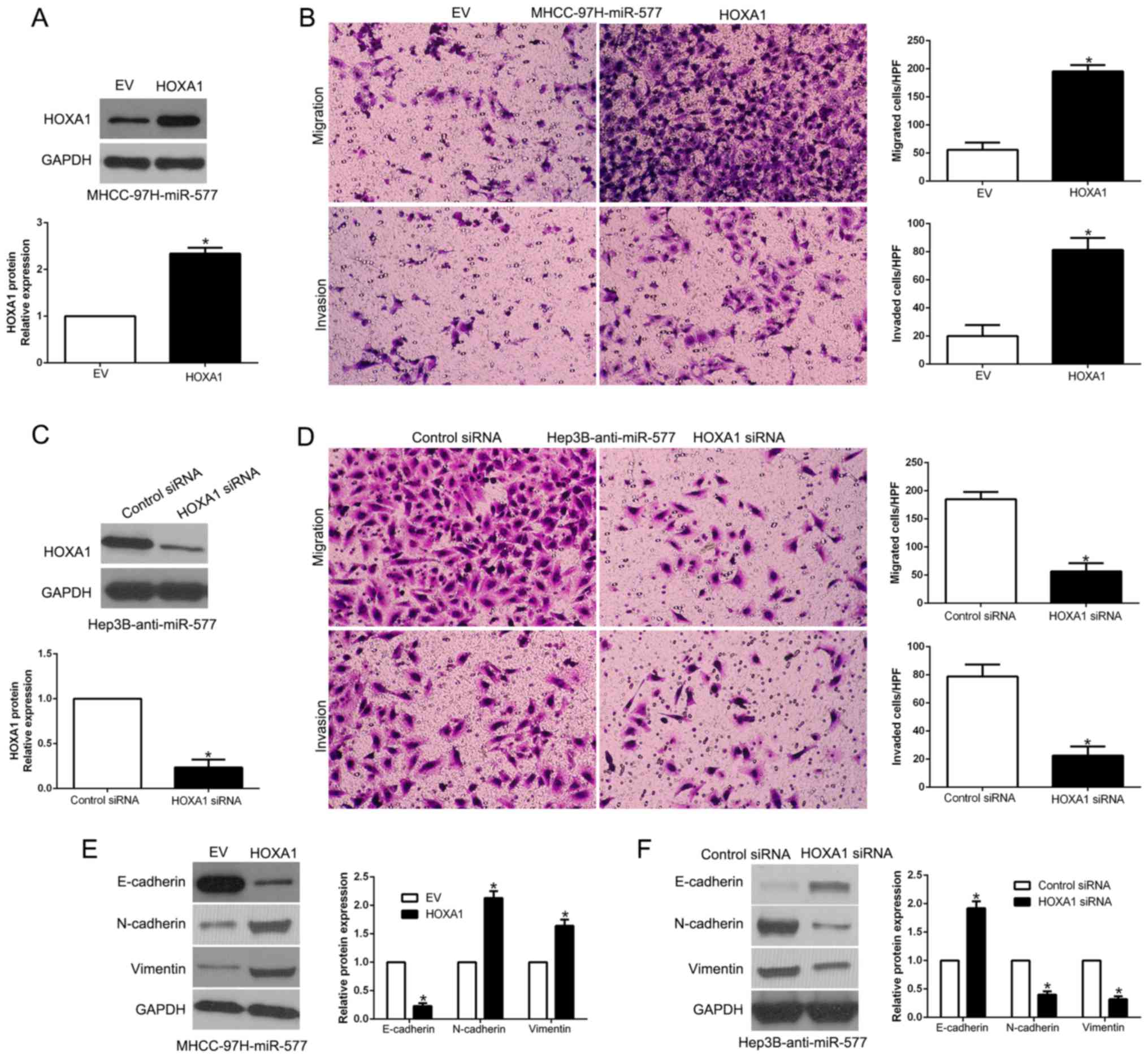 In conclusion, aberrant expression of microRNAs (miRNAs) is closely associated with HCC pathogenesis and tumorigenicity. Recent studies suggest that miR-577 is a cancer-related miRNA. In the present study, both in HCC tissues and cell lines, miR-577 expression was found to be downregulated. Decreased miR-577 was distinctly related to malignant clinicopathologic features and worse outcome of HCC patients. Functionally, miR-577 modulated HCC cell migration, invasion and EMT. Additionally, miR-577 directly targets HOXA1 to exert its effects on HCC cells. Taken together, miR-577 could act as a prognostic tumor biomarker and a potential target for molecular-targeted therapy of HCC.