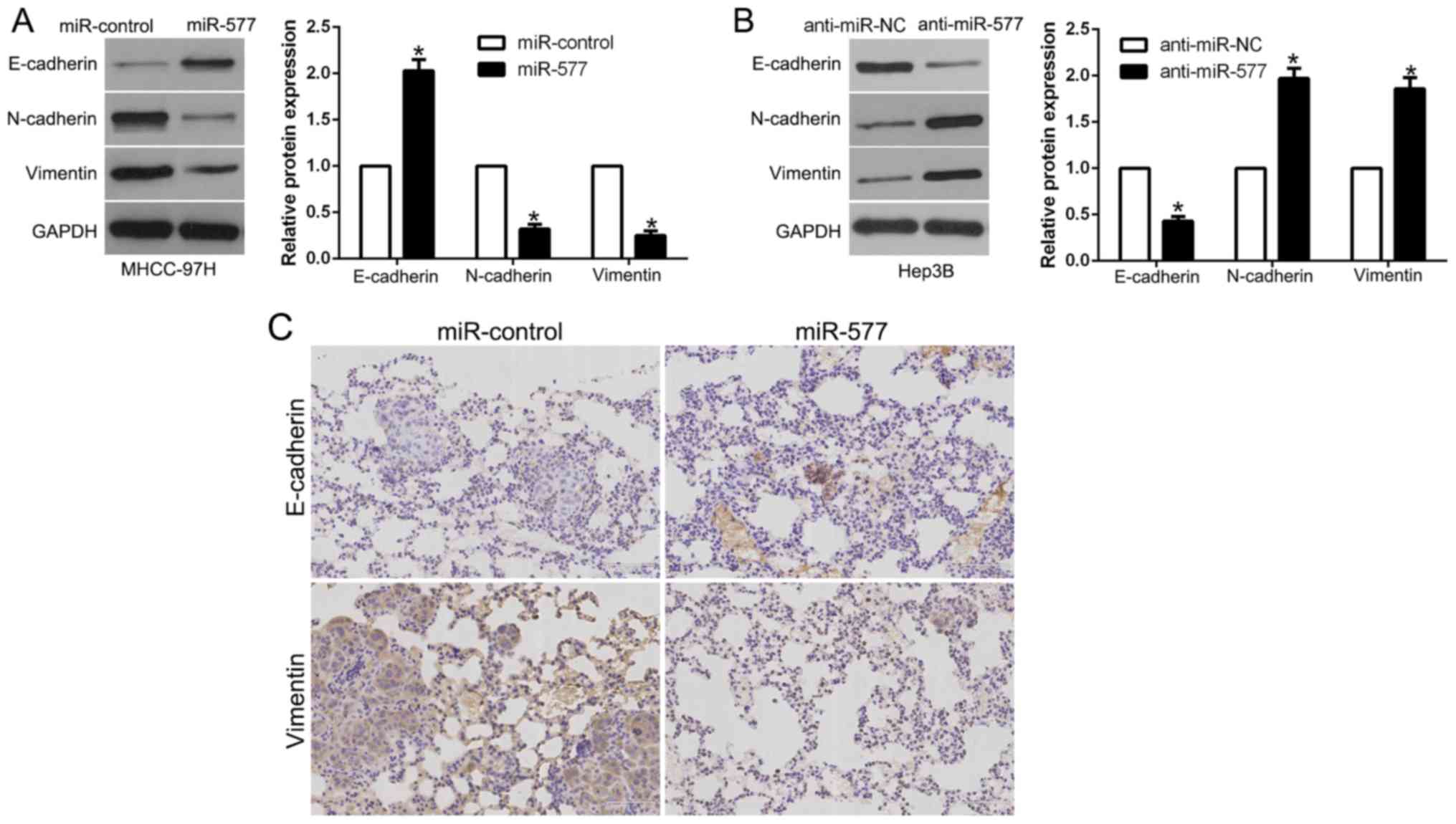 In order to explore the association between miR-577 and EMT, western blot analysis was performed. The results revealed that, in MHCC-97H cells, overexpression of miR-577 induced E-cadherin and suppressed N-cadherin and vimentin (P<0.05, Fig. 4A). However, in Hep3B cells, miR-577 knockdown showed the opposite effects (P<0.05, Fig. 4B). Moreover, we examined the metastatic phenotype of these cells and found that lung sections of the mice injected with the miR-577-overexpressing cells in fact showed increased E-cadherin expression and conversely decreased vimentin expression (Fig. 4C). Thus, our results revealed that miR-577 acts as an inhibitor of the EMT process in HCC cells.
