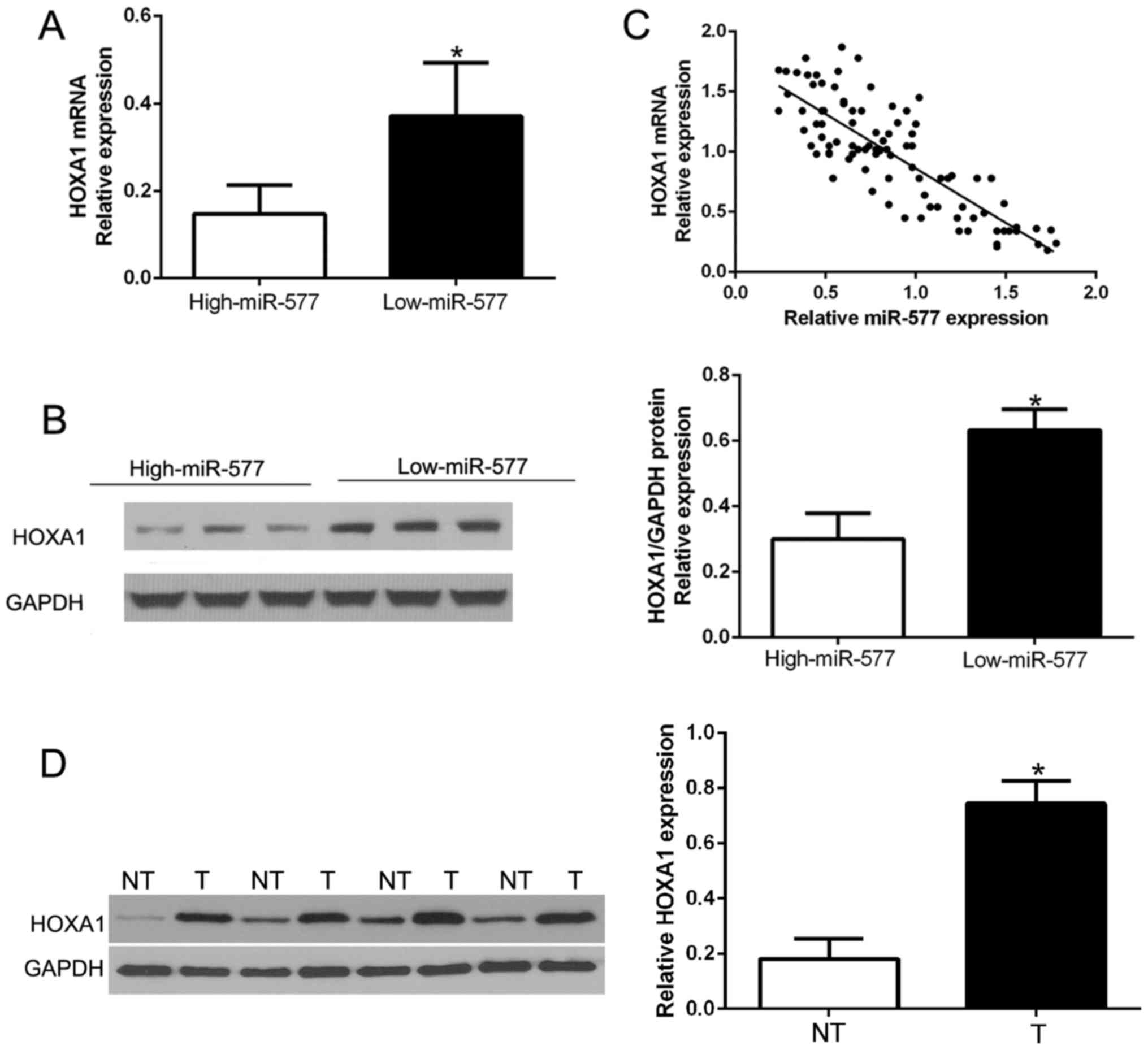 Next, we attempted to determine the correlation of miR-577 and HOXA1 in HCC. The expression levels of HOXA1 mRNA and protein in HCC tissues with different miR-577 expression were detected. As expected, tissues with high miR-577 had obviously lower HOXA1 mRNA and protein expression compared to the tissues with low miR-577 (P<0.05, Fig. 6A and B). Furthermore, there existed a negative correlation between HOXA1 mRNA and miR-577 in the HCC tissues (R2=0.6866, P<0.001, Fig. 6C). In addition, we performed western blot analysis to confirm that HOXA1 was overexpressed in HCC tissues compared to that in the corresponding adjacent non-tumor tissues (P<0.05, Fig. 6D). These results confirmed that HOXA1 acts as a downstream target of miR-577 in HCC, and HOXA1 is negatively regulated by miR-577 in HCC.
