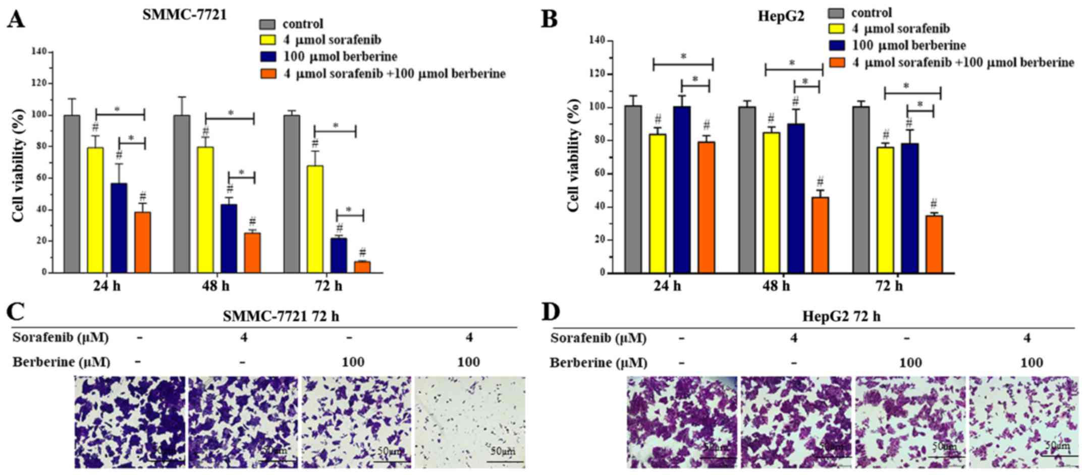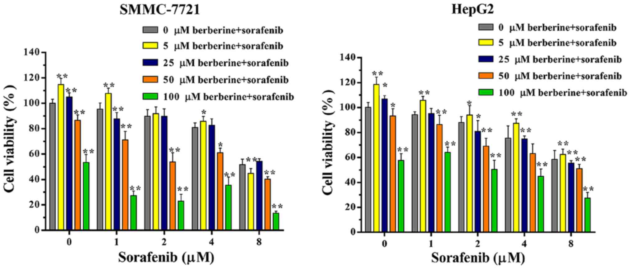 Two HCC cell lines (SMMC-7721 and HepG2) were obtained from the American Type Culture Collection (ATCC; Manassas, VA, USA). The cells were cultured in Dulbecco's modified Eagle's medium (DMEM; Gibco; Thermo Fisher Scientific, Inc., Waltham, MA, USA; cat. no. 8117220;) supplemented with 10% (v/v) fetal bovine serum (FBS) and 1% (v/v) penicillin/streptomycin (Gibco; Thermo Fisher Scientific, Inc.; cat. no. 10-378-016) and maintained at 37°C in a 5% CO2 incubator. Berberine was purchased from Selleck Chemicals (Houston, TX, USA; cat. no. S2271). Sorafenib was purchased from MedChemExpress (Monmouth Junction, NJ, USA; cat. no. Y-10201). Dimethyl sulfoxide (DMSO) was obtained from Sigma-Aldrich (Merck KGaA, Darmstadt, Germany; cat. no. 67-68-5).