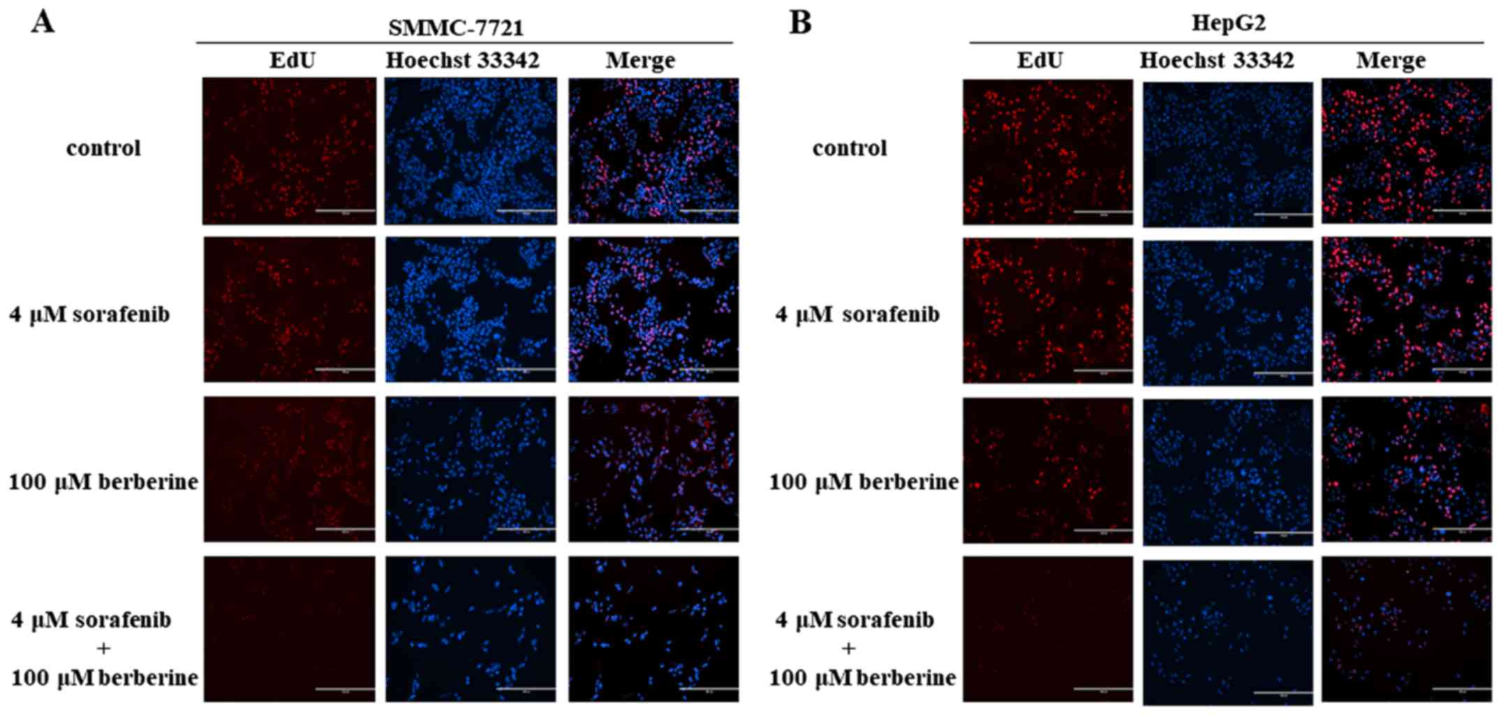 Edu and colony formation assays were conducted to assess the short-term and long-term effects of combined treatment with berberine and sorafenib on HCC cell proliferation. As shown in Fig. 4A, the combination of 100 µM berberine and 4 µM sorafenib significantly decreased the proliferation of SMMC-7721 cells when compared with that of the control and single agent groups. Furthermore, it was observed that HepG2 cells treated with the combination of 100 µM berberine and 4 µM sorafenib exhibited a lower proliferative ability in comparison with the other groups (Fig. 4B).