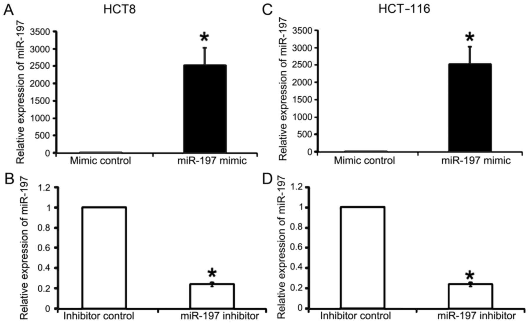 Total RNA was extracted using the Invitrogen™ TRIzol total RNA isolation reagent (Thermo Fisher Scientific, Inc.) and purified with the Column DNA Erasol kit (Tiangen Biotech Co., Ltd., Beijing, China) according to the manufacturer's instructions. mRNA levels were assessed with RT-qPCR using SYBR-Green I (Takara Biotechnology Co., Ltd., Dalian, China). The gene expression level was normalized to the endogenous reference gene GAPDH. The experiments were performed in triplicate. The primers for RT-qPCR are listed in Table III. The primers for miR-197 and U6 were purchased from Qiagen (Duesseldorf, Germany) (Table IV). Reverse transcription of miRNAs was performed with a miScript Reverse Transcription kit (Qiagen). The expression of mature miRNAs was determined using miRNA-specific quantitative RT-qPCR (Takara Biotechnology Co., Ltd.). The expression levels were normalized to the U6 endogenous control and assessed by the comparative Ct (ΔΔCq) method (15).