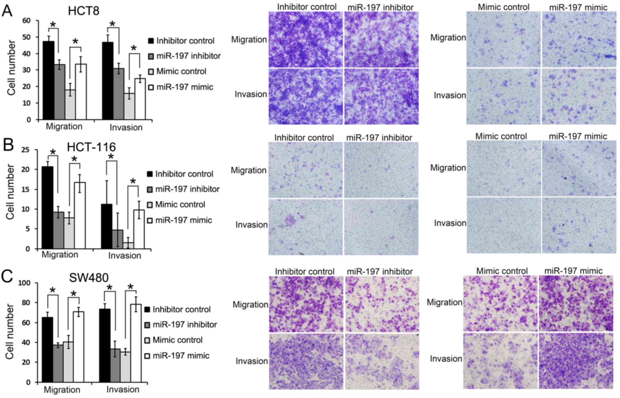 We first evaluated the efficacy of miR-197 overexpression and inhibition using synthetic miR-197 mimic, miR-197 inhibitor and corresponding controls in CRC cell lines (Fig. 1). We then investigated the effect of miR-197 on the migration and invasion in colorectal cell lines. HCT8, HCT116 and SW480 cells were transfected with either miR-197 mimic, mimic control, miR-197 inhibitor or inhibitor control and then subjected to cell migration and invasion assays (Fig. 2). In the HCT8 cell line, significantly more tumor cells in the miR-197 mimic group had migrated to the lower surface of the filter compared with the miR-197 mimic control group (33.50±4.65 vs. 18.00±3.91, P<0.05) in the migration assay and similarly, significantly more cells invaded to the lower surface in the miR-197 mimic group than its control group in the invasion assay (24.75±2.21 vs. 18.00±3.91, P<0.05, Fig. 2A). On the contrary, significant less HCT8 cells in miR-197 inhibitor group were found on the lower surface of the filter compared with its control group in the migration assay (32.25±2.98 vs. 47.25±3.20, P<0.05) and also in the invasion assay (31.00±3.16 vs. 46.75±4.42, P<0.05, Fig. 2A). Furthermore, similar results were also achieved in the HCT116 and SW480 cells (Fig. 2B and C), indicating that miR-197 could regulate migration and invasion in these 3 CRC cell lines in vitro.