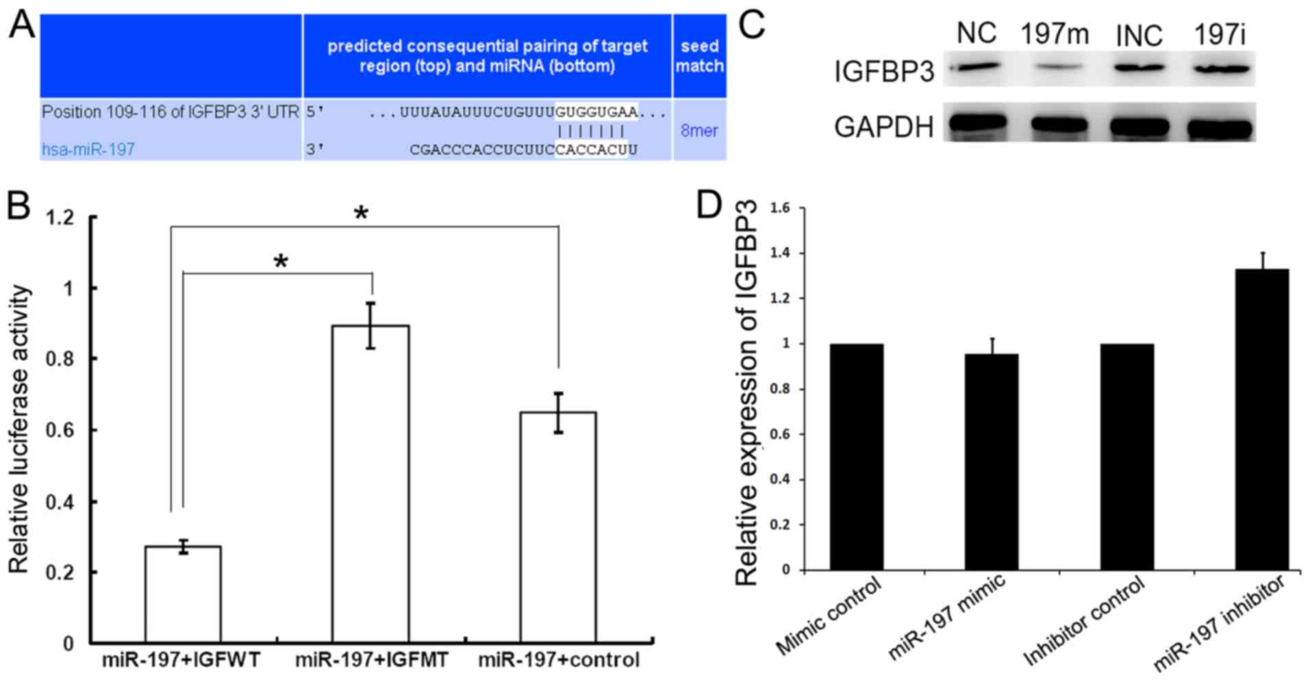 The synthetic miR-197 mimic, miR-197 inhibitor, mimic control and inhibitor control were purchased from GenePharma Inc. (Shanghai, China), and their sequences are listed in Table I. The siRNAs for IGFBP3 and siRNA control were synthesized (Invitrogen; Thermo Fisher Scientific, Inc.) and the sequences are listed in Table II.