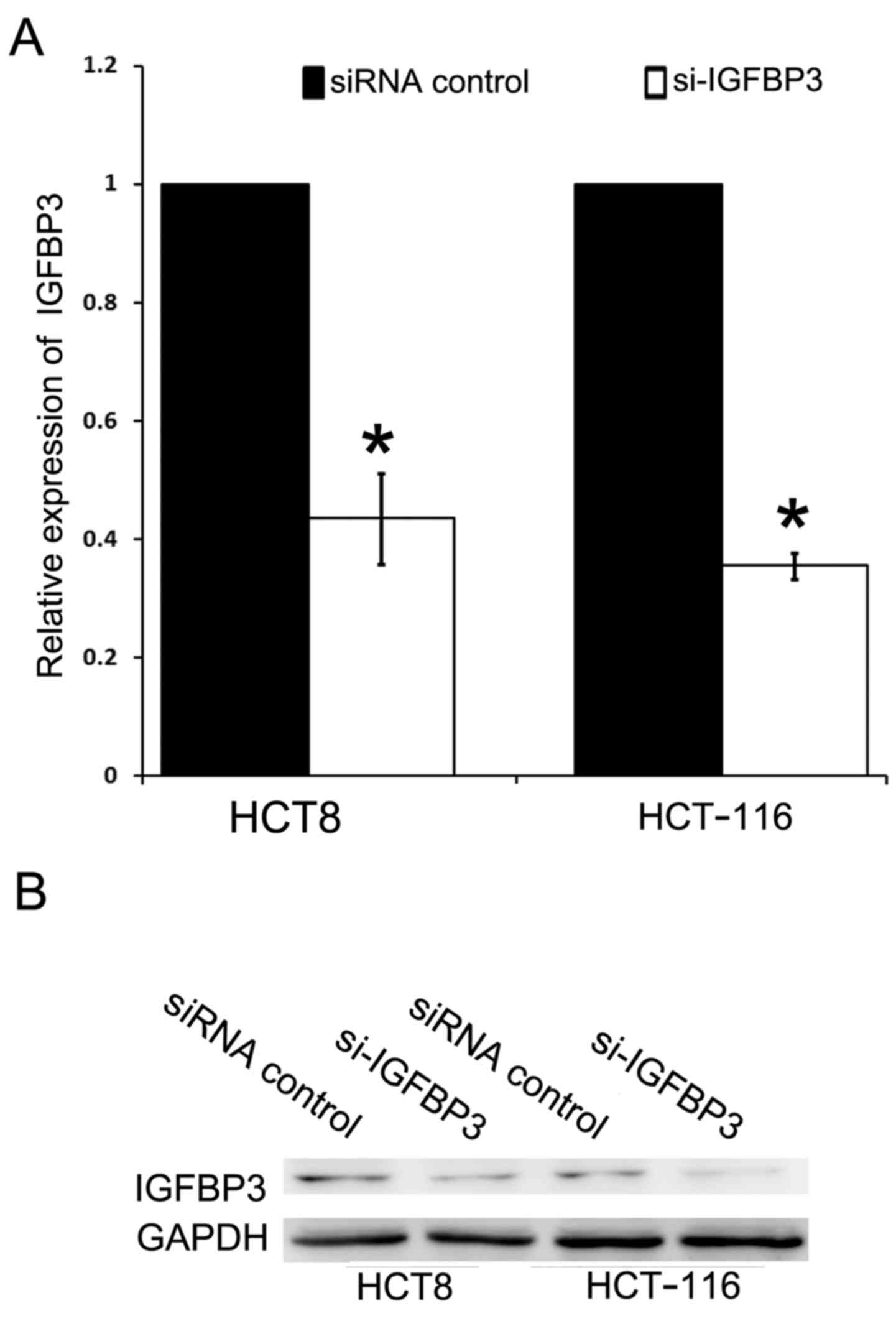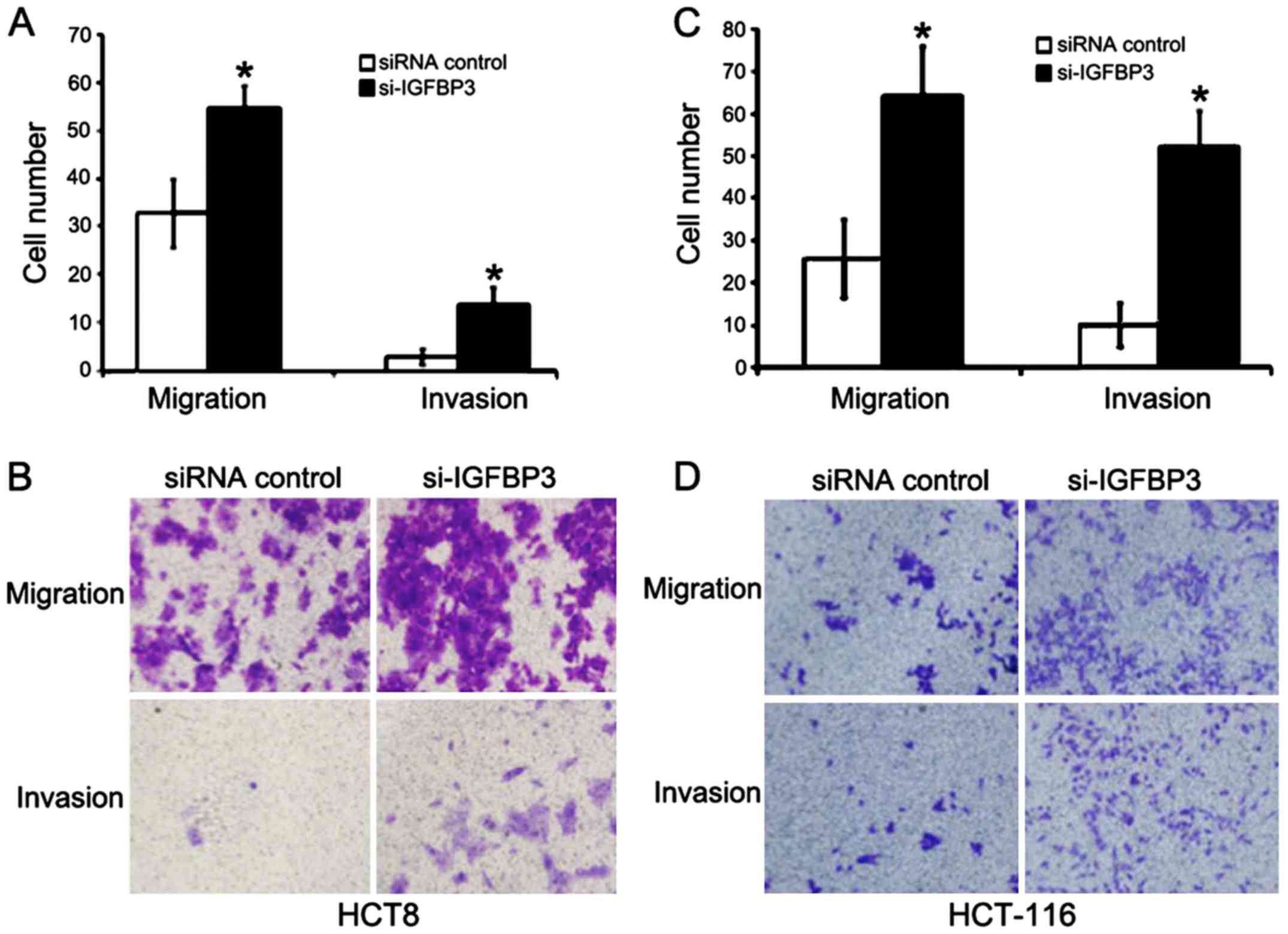 We then investigated the role of IGFBP3 in CRC cell migration and metastasis. Small interfering RNA (siRNA) designed to target IGFBP3 was employed. The transfection of siRNA resulted in a significant reduction in IGFBP3 mRNA and protein level in HCT8 and HCT-116 cells compared to the siRNA-control (Fig. 5). Both cell lines were transfected with either IGFBP3 siRNA (si-IGFBP3) or siRNA-control, and then subjected to cell migration and cell invasion assay. In the migration assay, the number of migratory HCT8 cells in the si-IGFBP3 group was significantly greater than the migratory HCT8 cells in the si-control group (54.75±4.57 vs. 32.75±7.18, P<0.05, Fig. 6A and B). In addition, significantly more HCT8 cells in the si-IGFBP3 group had invaded to the lower surface of filters compared with those in si-control group (12.75±3.50 vs. 2.75±1.70, P<0.05) in the invasion assay (Fig. 6A and B). Similar results were also achieved in HCT-116 cells (Fig. 6C and D). Cell motility of both assays was significantly enhanced following IGFBP3 downregulation compared with the control in HCT-116 cells, with similar results in HCT8 cells, which indicated that IGFBP3 was a suppressor protein in the process of migration and invasion in CRC cells.