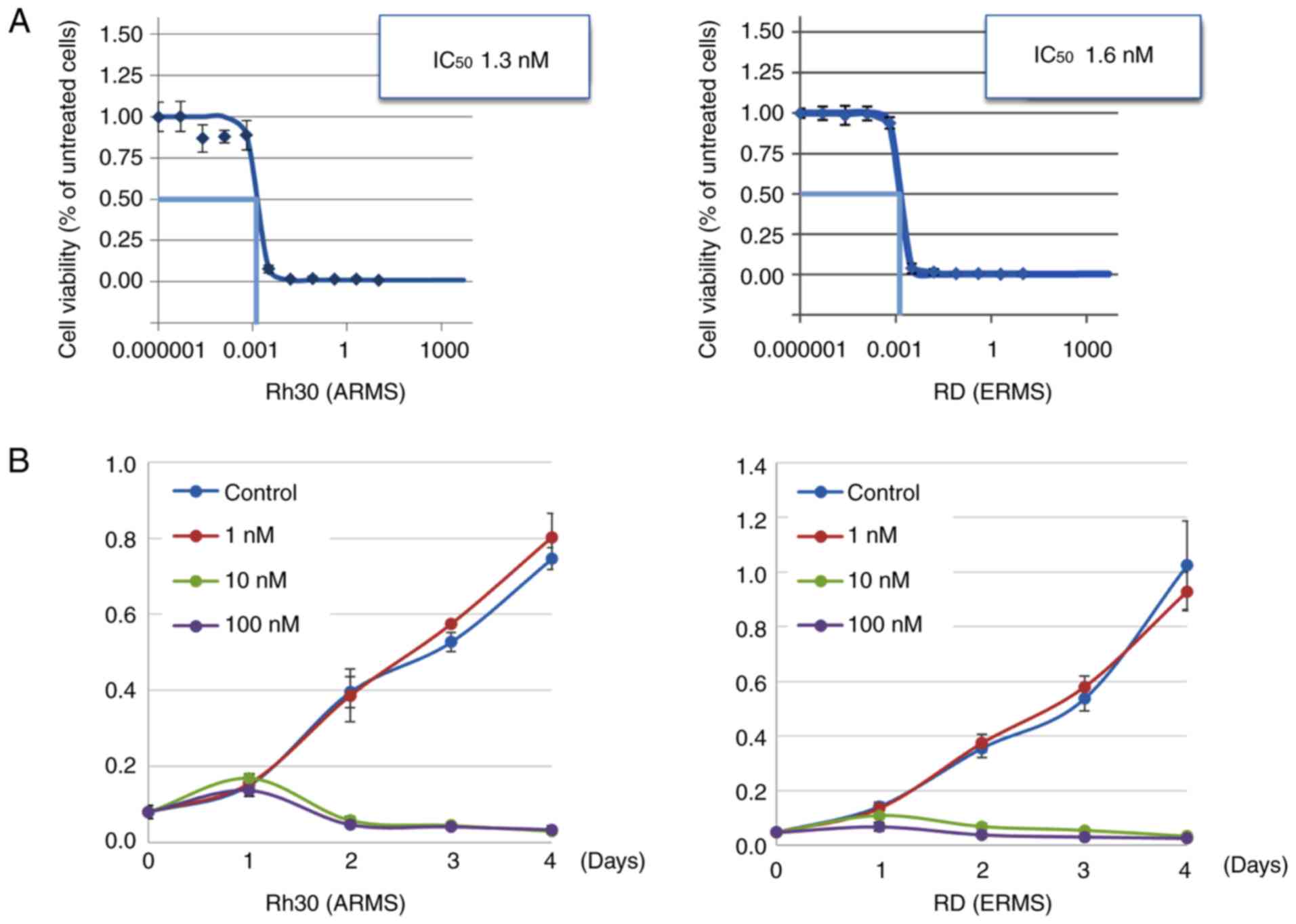 We used the human ARMS cell lines SJ-Rh30 (Rh30), SJ-Rh41 (Rh41), SJ-Rh3 (Rh3), SJ-Rh4 (Rh4), SJ-Rh18 (Rh18) and SJ-Rh28 (Rh28) that were kindly provided by Peter J. Houghton M, San Antonio, TX, USA), and the embryonal RMS (ERMS) cell lines RD that was obtained from JCRB (Japanese Collection of Research Bioresources) Cell Bank and RMS-YM that was kindly provided by Naoki Kakazu M.D. (Department of Environmental and Preventive Medicine, Shimane University School of Medicine, Shimane, Japan) (5,19). They were maintained in Dulbecco's modified Eagle's medium (DMEM) supplemented with 10% fetal bovine serum (FBS) at 37°C in a 5% CO2 incubator. OBP-801 (Oncolys BioPharma, Inc., Tokyo, Japan) was dissolved in dimethyl sulfoxide (DMSO) and stored as a 1-mM stock solution in 50-µl aliquots at −20°C. The percentage of DMSO in all experiments was <0.01%.