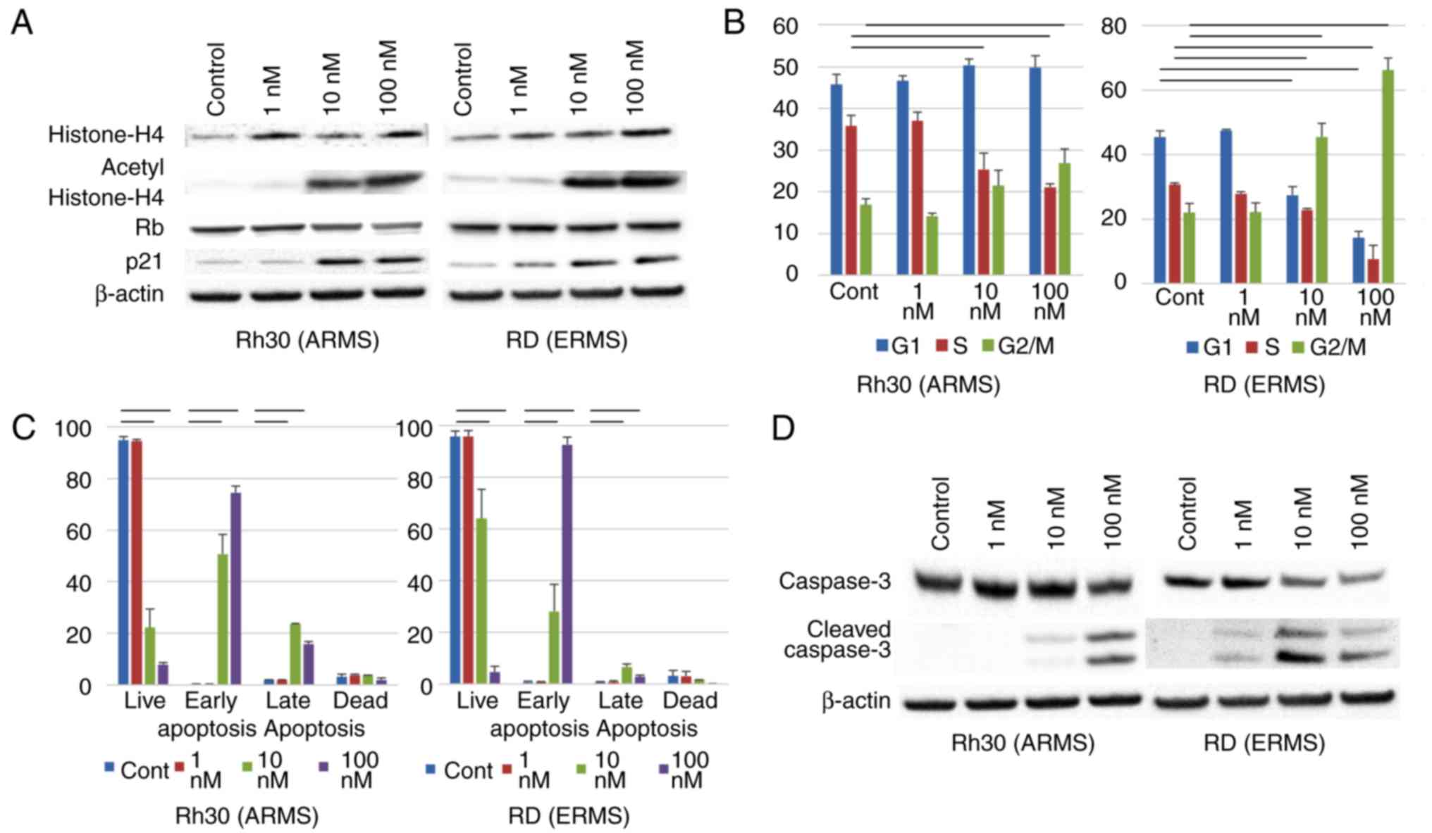 In conclusion, to the best of our knowledge, this is the first study revealing that treatment of RMS cells with the novel HDAC inhibitor OBP-801 induced M-phase arrest followed by apoptosis via mitotic catastrophe. These results indicated that OBP-801 may be promising for the treatment of RMS. We believe that this drug should be chosen for future clinical trials.
