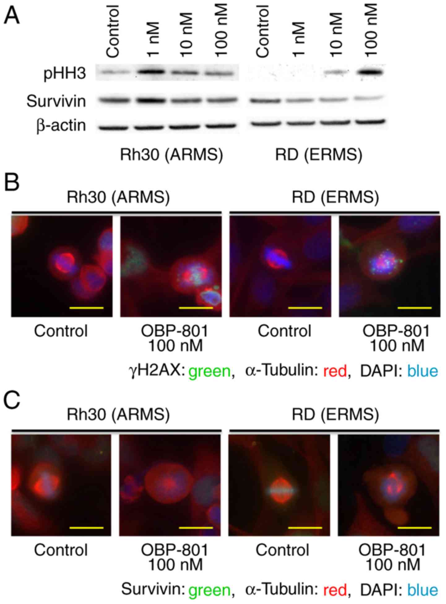 To examine if OBP-801 caused G2- or M-phase arrest, we immunoblotted with an antibody against phospho-histone H3, a marker of mitosis. Cells treated with OBP-801 had higher phosphorylation levels of histone H3 than control cells 24 h after the treatment; the effect was concentration-dependent (Fig. 3A). We next analyzed the nuclear morphology of RMS cells with OBP-801 treatment. We found that control cells exhibited normal chromosome distribution in metaphase, with correctly formed mitotic spindles. However, upon treatment with OBP-801, dividing RMS cells exhibited aberrant metaphase morphologies: their chromosomes were not aligned at the metaphase plate, they had an abnormal mitotic spindle distribution, survivin was not recruited to the centromeres, and exhibited lower levels of survivin than that in control cells (Fig. 3B and C); OBP-801 affected the abundance of survivin in a dose-dependent manner (Fig. 3A). In addition, OBP-801-treated RMS cells were stained with the γH2AX antibody, which indicated that they entered mitosis with damaged DNA (Fig. 3C).