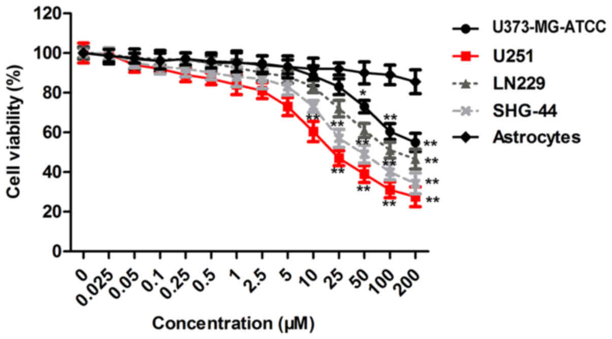 To clarify the influence of MTB on GBM cells, we conducted a CCK-8 assay using U373-MG-ATCC, U251, SHG-44 and LN229 cells and astrocytes treated with MTB at concentrations of 0 to 200 µM for 24 h, respectively. The result (Fig. 1) showed that MTB exerted an inhibitory effect on the viability of GBM cells in a dose-dependent manner (P<0.01; compared to the astrocyte group). Particularly, U251 cells showed more sensitivity to MTB than the other cell lines. The concentration of MTB that inhibited cell viability was 2.5 µM in U251 cells. In addition, treatment with MTB at 2.5 µM did not induce significant cytotoxicity of U251 cells. These data suggest that MTB is a potential anticancer agent against GBM cells, particularly U251 cells. Thus, 2.5 µM of MTB and U251 cells were used for subsequent experiments.