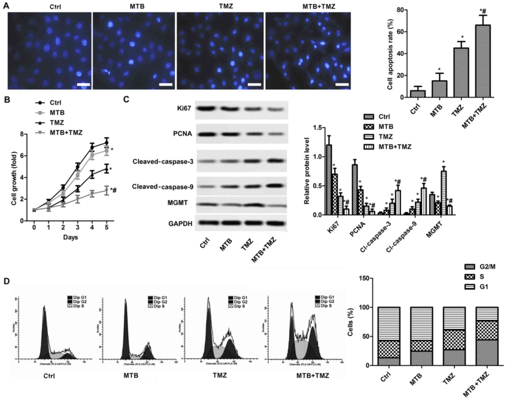 A concentration of 100 µM TMZ was used as previously described (21). As shown in Fig. 2A, both MTB and TMZ promoted the apoptosis of U251 cells compared with the control (P<0.05). As shown in Fig. 2B, both MTB and TMZ suppressed the growth of U-251MG cells compared with the control (P<0.05). However, the combination of MTB and TMZ enhanced the proliferation-inhibiting effect compared with either the MTB or TMZ group (P<0.05). In addition, the combination of MTB and TMZ enhanced the apoptosis-promoting effect compared to TMZ or MTB used alone at the same dose (P<0.05). The present results were verified by western blot analysis of Ki-67, PCNA, cleaved caspase-3 and cleaved caspase-9 (Fig. 2C). The relative expression of Ki-67 and PCNA were significantly reduced by MTB and TMZ, and the combination therapy (P<0.05), while the expression of cleaved caspase-3 and cleaved caspase-9 exhibited inverse results. We also assessed the effect of MTB on cell cycle distribution (Fig. 2D). MTB and TMZ combination significantly arrested the cell cycle at the G2 phase.