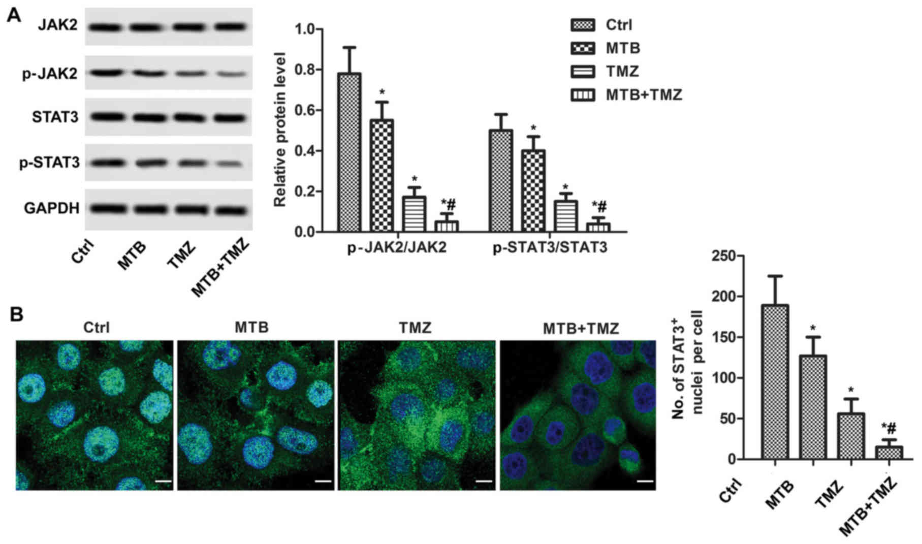 To elucidate the mechanism of MTB in autophagy induction, expression levels of JAK2 and STAT3 were determined by western blot analysis. As shown in Fig. 4A, western blot analysis showed that the combination of MTB and TMZ decreased the phosphorylation levels of JAK2 and STAT3 compared to that following treatment with TMZ or MTB used alone at the same dose (P<0.05). In particular, MTB was observed to suppress STAT3 nuclear translocation. As shown in Fig. 4B, the nuclear level of p-STAT3 was high in the untreated U251 cells; whereas, the nuclear level of p-STAT3 was significantly reduced by MTB and TMZ. In addition, the nuclear level of p-STAT3 in the MTB + TMZ group was significantly decreased compared to that following TMZ or MTB used alone at the same dose (P<0.05).