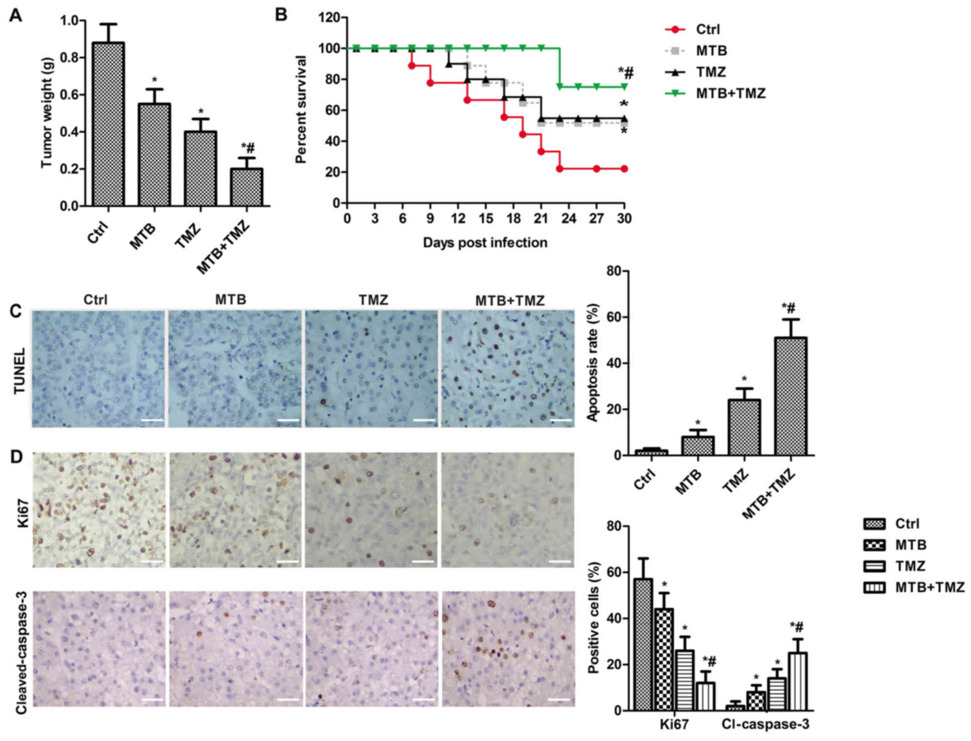 For testing of the efficacy of MTB combined with TMZ in vivo, orthotopic xenograft models were established. Twenty 6-week-old male BALB/c-nu/nu mice weighing 16–18 g were bred in aseptic cages, which were kept in an isolator unit with filtered air. The mice had access to water and food ad libitum. U251 cell suspension (0.1 ml) [2-5×107/ml Hank's balanced salt solution (HBSS), Gibco; Thermo Fisher Scientific, Inc.] was stereotypically injected into the left striata of mice. After the tumor was established, the mice were randomized into the following groups: Ctrl; MTB (50 mg/kg/day body weight) (19); TMZ (20 mg/kg/day body weight); MTB + TMZ (50 mg/kg/day MTB + 20 mg/kg/day TMZ). All mice were administered the drug or saline daily by oral gavage 1 day after tumor cell injection (18). All animals were sacrificed at 30 days and tumors were collected. Tumor weight was measured. All animal protocols were approved by the Beijing Tiantan Hospital and Capital Medical university laws governing animal care.