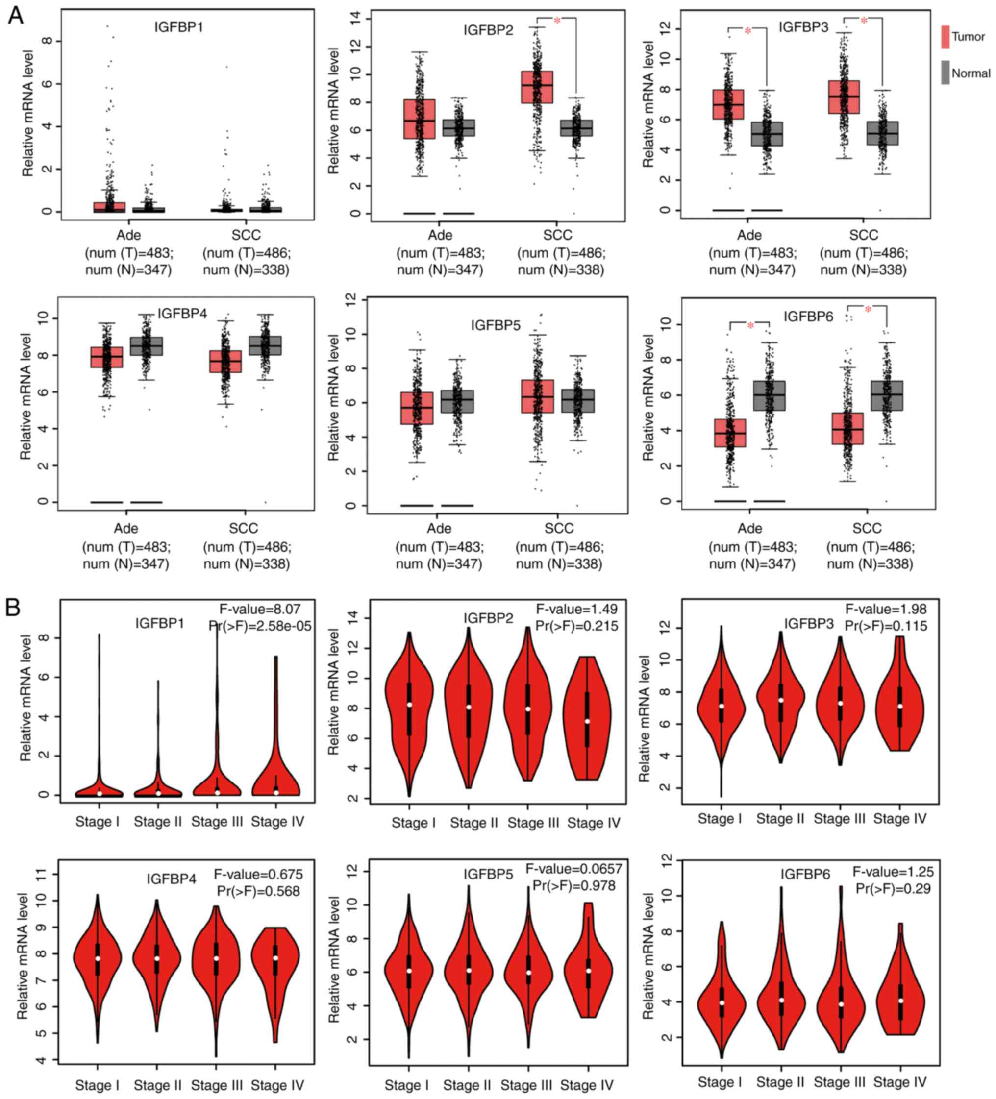 Studies on IGFBP4 in NSCLC are limited. However, in epithelial ovarian tumors, IGFBP4 mRNA was highly expressed, but was not associated with OS in patients with cancer (43). It was also observed that high IGFBP4 mRNA expression was significantly associated with unfavorable OS for all patients with NSCLC and patients with Ade but not SCC. However, differential IGFBP4 expression was not observed in tumor and healthy tissues.