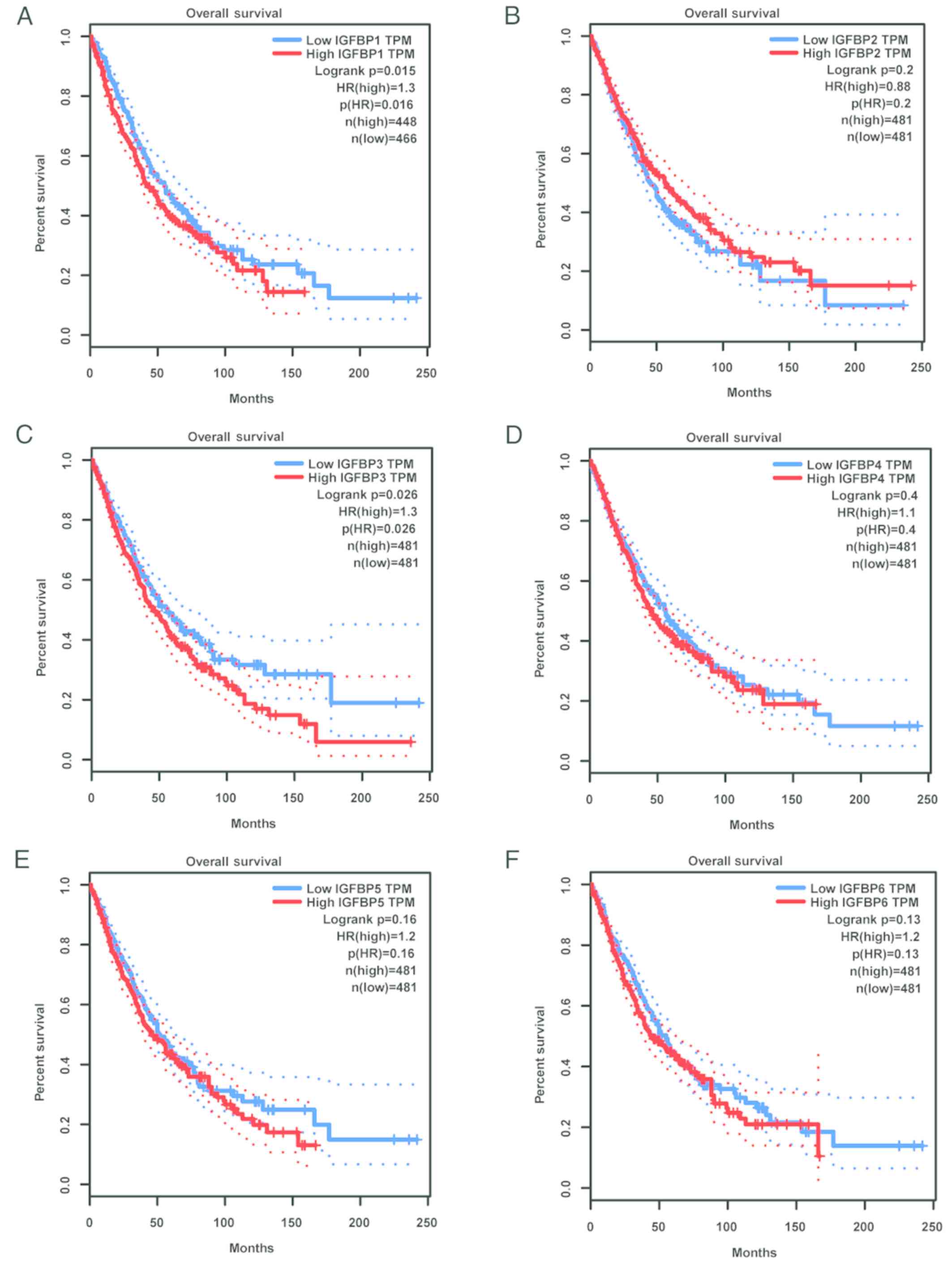 IGF proteins regulate cellular proliferation, differentiation, apoptosis, and carcinogenesis, and IGFBPs modulate their signaling through IGF sequestration. The IGF-independent functions of IGFBPs depend on their interactions with many signaling pathways, which include both stimulatory and inhibitory cell-surface receptors such as the epidermal growth factor and transforming growth factor (TGF)-β receptors. In addition, IGFBPs regulate enzymes involved in sphingolipid metabolism. In this manner, IGFBPs can affect the balance between growth-inhibitory lipids, such as ceramides, and growth-stimulatory lipids, such as sphingosine-1-phosphate (25). In the present study, a bioinformatics approach was used to examine the effects of these genes on NSCLC.